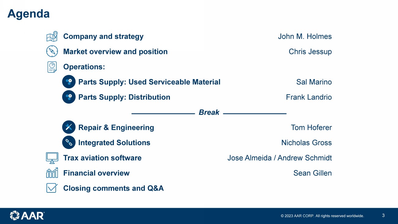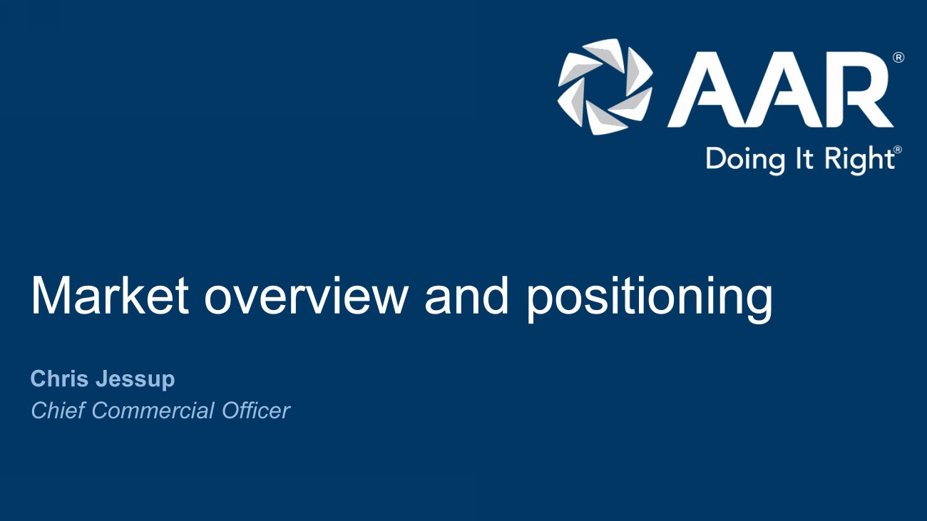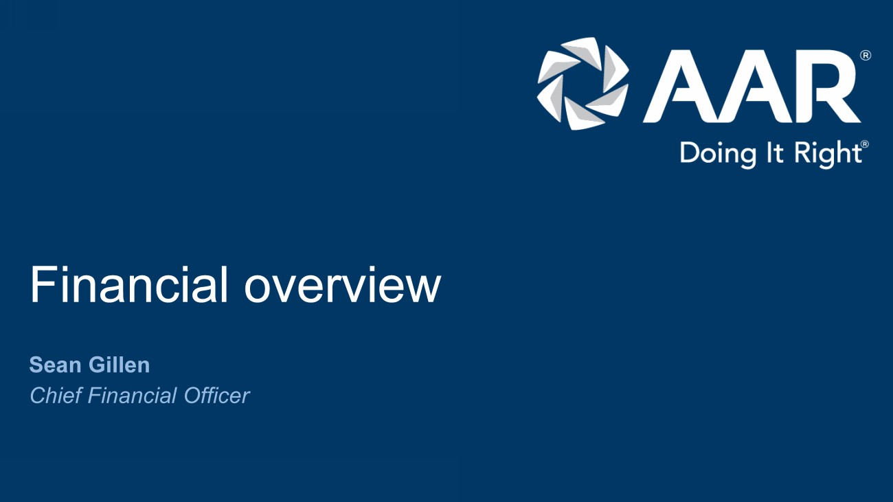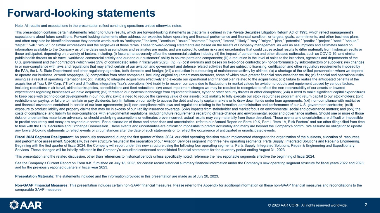 © 2023 AAR CORP. All rights reserved worldwide. 2 Forward - looking statements Note: All results and expectations in the presentation reflect continuing operations unless otherwise noted. This presentation contains certain statements relating to future results, which are forward - looking statements as that term is d efined in the Private Securities Litigation Reform Act of 1995, which reflect management’s expectations about future conditions. Forward - looking statements often address our expected future operating and financial perfo rmance and financial condition, or targets, goals, commitments, and other business plans, and often may also be identified because they contain words such as “anticipate,” “believe,” “continue,” “could,” “estimate,” “e xpect,” “intend,” “likely,” “may,” “might,” “plan,” “potential,” “predict,” “project,” “seek,” “should,” “target,” “will,” “would,” or similar expressions and the negatives of those terms. These forward - looking statements are based o n the beliefs of Company management, as well as assumptions and estimates based on information available to the Company as of the dates such assumptions and estimates are made, and are subject to certain risk s a nd uncertainties that could cause actual results to differ materially from historical results or those anticipated, depending on a variety of factors, including: (i) factors that adversely affect the commercial aviation in dus try; (ii) the impact of pandemics and other disease outbreaks, such as COVID - 19, and similar public health threats on air travel, worldwide commercial activity and our and our customers’ ability to source parts and com pon ents; (iii) a reduction in the level of sales to the branches, agencies and departments of the U.S. government and their contractors (which were 29% of consolidated sales in fiscal year 2023); (iv) (v) cost overruns and lo sses on fixed - price contracts; (vi) nonperformance by subcontractors or suppliers; (vii) changes in or non - compliance with laws and regulations that may affect certain of our aviation and government and defense related activi ties that are subject to licensing, certification and other regulatory requirements imposed by the FAA, the U.S. State Department and other regulatory agencies, both domestic and foreign; (viii) a reduction in outsourcin g o f maintenance activity by airlines; (ix) a shortage of the skilled personnel on whom we depend to operate our business, or work stoppages; (x) competition from other companies, including original equipment manufacturers, so me of which have greater financial resources than we do; (xi) financial and operational risks arising as a result of operating internationally; (xii) inability to integrate acquisitions effectively and execute our opera tio nal and financial plan related to the acquisitions; (xiii) failure to realize the anticipated benefits of the acquisition of Trax USA Corp. (“ Trax ”) and difficulties integrating Trax’s operations:(xiv) inability to recover our costs due to fluctuations in market values for aviation products and equipment caus ed by various factors, including reductions in air travel, airline bankruptcies, consolidations and fleet reductions; (xv) asset impairment charges we may be required to recognize to reflect the non - recoverability of our assets or lowered expectations regarding businesses we have acquired; (xvi) threats to our systems technology from equipment failures, cyber or ot her security threats or other disruptions; (xvii) a need to make significant capital expenditures to keep pace with technological developments in our industry; (xviii) a need to reduce the carrying value of our assets; (xix ) i nability to fully execute our stock repurchase program and return capital to our stockholders; (xvii) restrictions on paying, or failure to maintain or pay dividends; (xx) limitations on our ability to access the debt and equit y c apital markets or to draw down funds under loan agreements; (xxi) non - compliance with restrictive and financial covenants contained in certain of our loan agreements; (xxii) non - compliance with laws and regulations relating to the formation, administration and performance of our U.S. government contracts; (xxiii) exposure to product liability and property claims that may be in excess of our liability insurance coverage; (xxiv) impacts f rom stakeholder and market focus on environmental, social and governance matters; and (xxv) the costs of compliance, and liability for non - compliance, with environmental regulations, including future requirements regarding c limate change and environmental, social and governance matters. Should one or more of those risks or uncertainties materialize adversely, or should underlying assumptions or estimates prove incorrect, actual results m ay vary materially from those described. Those events and uncertainties are difficult or impossible to predict accurately and many are beyond our control. For a discussion of these and other risks and uncertainties, refer to our Annual Report on Form 10 - K, Part I, “Item 1A, Risk Factors” and our other filings filed from time to time with the U.S. Securities and Exchange Commission. These events and uncertainties are difficult or impossible to predi ct accurately and many are beyond the Company’s control. We assume no obligation to update any forward - looking statements to reflect events or circumstances after the date of such statements or to reflect the occurrence of anticipated or unanticipated events. Fiscal 2024 Segment Realignment: As previously announced, during the first quarter of fiscal 2024, our chief operating decision maker implemented changes to t he organization of the business, allocation of resources, and performance assessment. Specifically, this new structure resulted in the separation of our Aviation Services segment into th ree new operating segmen