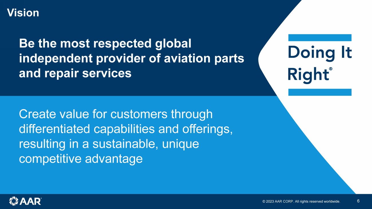© 2023 AAR CORP. All rights reserved worldwide. 5 John M. Holmes Joined AAR in 2001 Named General Manager of AAR’s parts trading business in 2003 Progressively assumed responsibility for the other businesses that comprise Aviation Services with a focus on achieving growth and operational efficiencies Appointed President and Chief Operating Officer in 2017 Named President and Chief Executive Officer in 2018 Elected Chairman of the Board of Directors in 2023