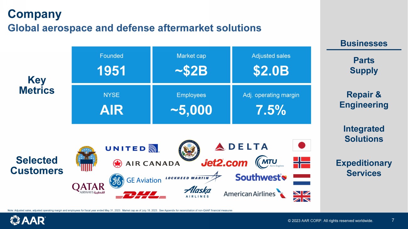 © 2023 AAR CORP. All rights reserved worldwide. 6 Vision Be the most respected global independent provider of aviation parts and repair services Create value for customers through differentiated capabilities and offerings, resulting in a sustainable, unique competitive advantage