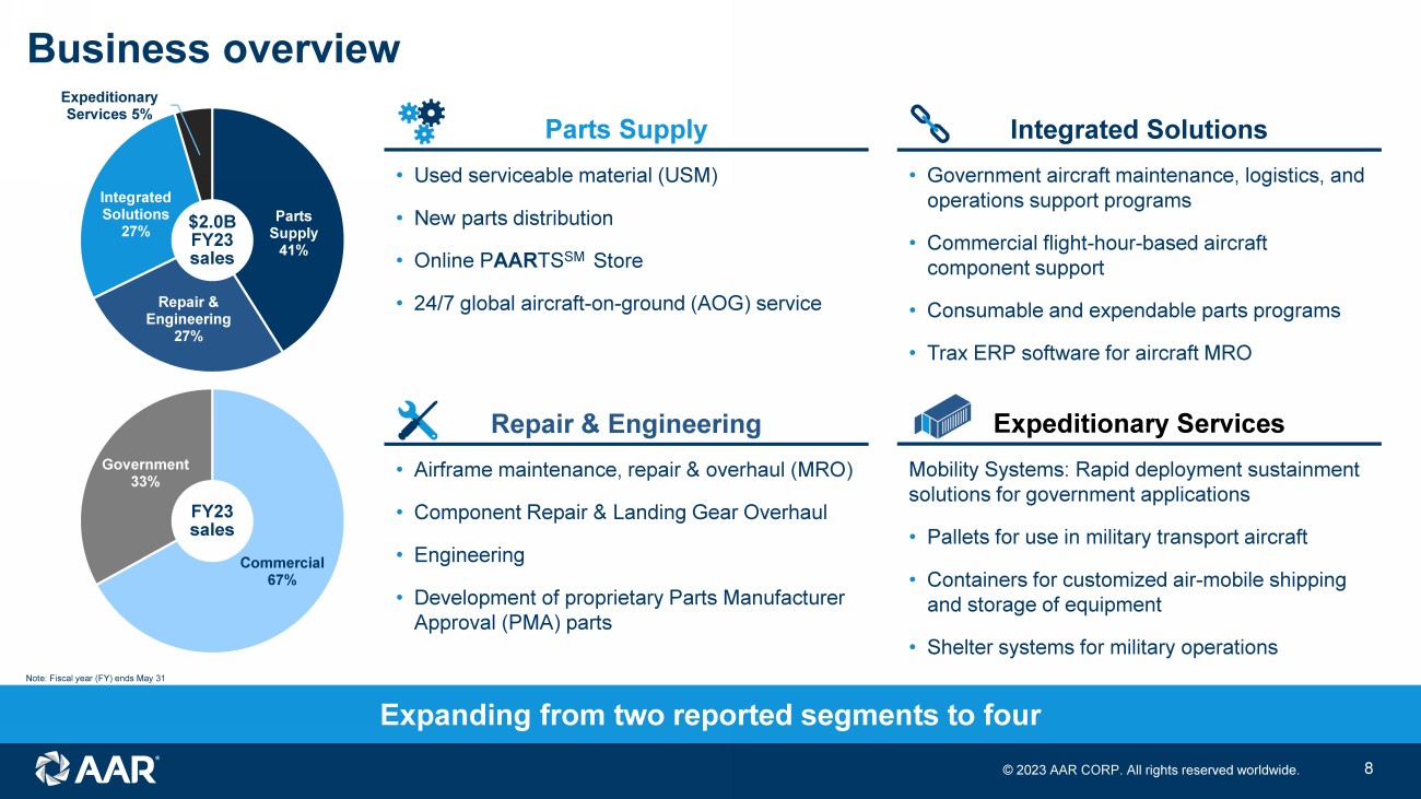 © 2023 AAR CORP. All rights reserved worldwide. 7 Global aerospace and defense aftermarket solutions Company Founded 1951 Market cap ~$2B Adjusted sales $2.0B NYSE AIR Employees ~5,000 Adj. operating margin 7.5% Note: Adjusted sales, adjusted operating margin and employees for fiscal year ended May 31, 2023. Market cap as of July 18, 202 3. See Appendix for reconciliation of non - GAAP financial measures Key Metrics Businesses Parts Supply Repair & Engineering Integrated Solutions Expeditionary Services Selected Customers
