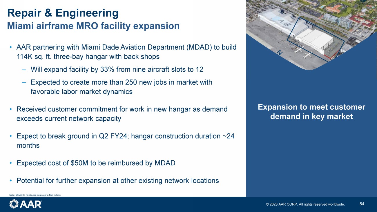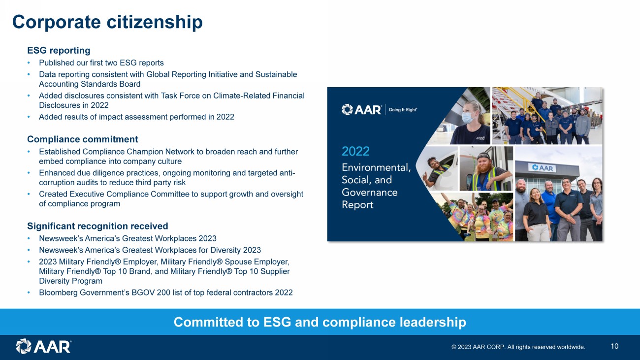 © 2023 AAR CORP. All rights reserved worldwide. 9 Miami airframe MRO facility expansion Repair & Engineering • AAR partnering with Miami Dade Aviation Department (MDAD) to build 114K sq. ft. three - bay hangar with back shops ‒ Will expand facility by 33% from nine aircraft slots to 12 ‒ Expected to create more than 250 new jobs in market with favorable labor market dynamics • Received customer commitment for work in new hangar as demand exceeds current network capacity • Expect to break ground in Q2 FY24; hangar construction duration ~24 months • Expected cost of $50M to be reimbursed by MDAD • Potential for further expansion at other existing network locations Note: MDAD to reimburse costs up to $50 million Expansion to meet customer demand in key market