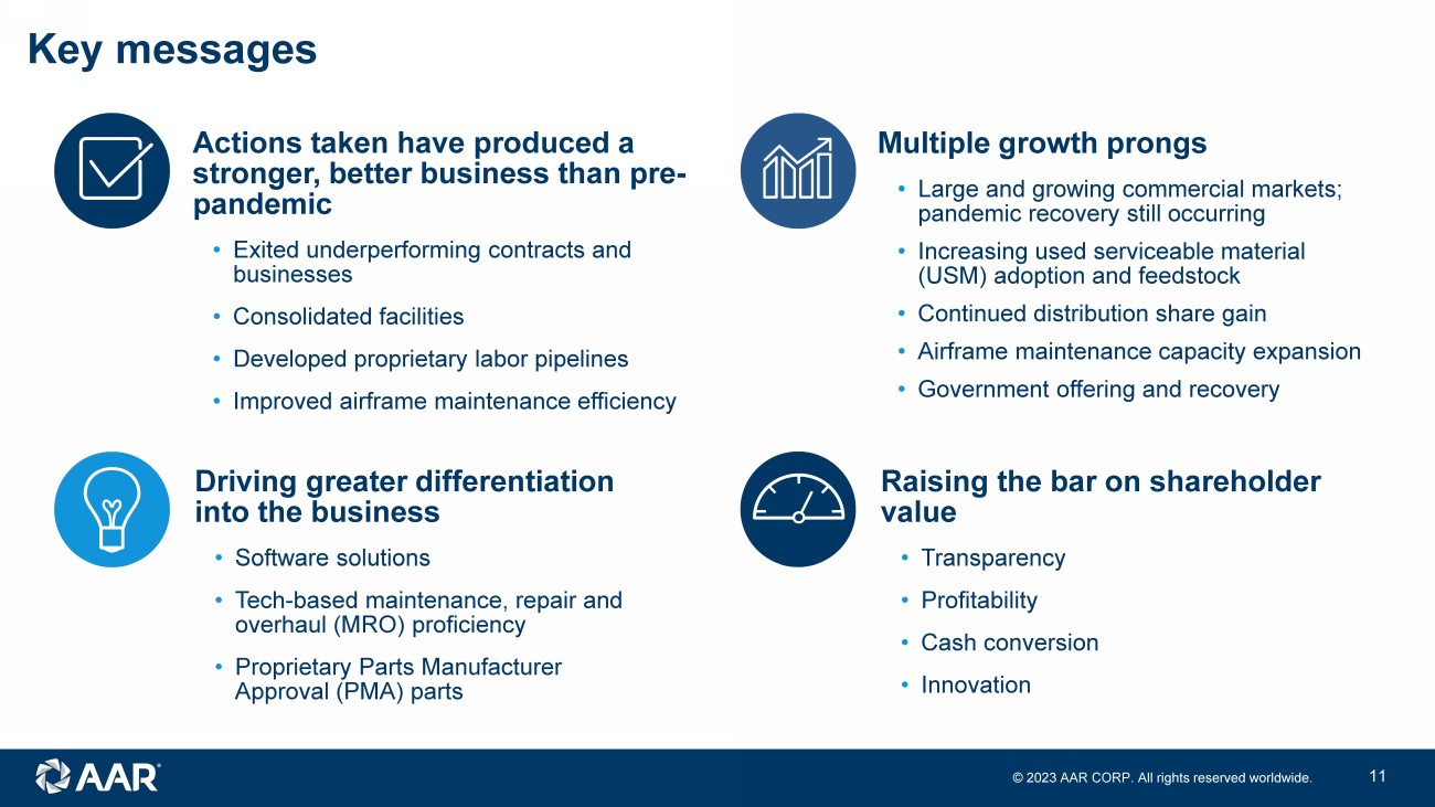 © 2023 AAR CORP. All rights reserved worldwide. 10 Corporate citizenship ESG reporting • Published our first two ESG reports • Data reporting consistent with Global Reporting Initiative and Sustainable Accounting Standards Board • Added disclosures consistent with Task Force on Climate - Related Financial Disclosures in 2022 • Added results of impact assessment performed in 2022 Compliance commitment • Established Compliance Champion Network to broaden reach and further embed compliance into company culture • Enhanced due diligence practices, ongoing monitoring and targeted anti - corruption audits to reduce third party risk • Created Executive Compliance Committee to support growth and oversight of compliance program Significant recognition received • Newsweek’s America’s Greatest Workplaces 2023 • Newsweek’s America’s Greatest Workplaces for Diversity 2023 • 2023 Military Friendly® Employer, Military Friendly® Spouse Employer, Military Friendly® Top 10 Brand, and Military Friendly® Top 10 Supplier Diversity Program • Bloomberg Government’s BGOV 200 list of top federal contractors 2022 Committed to ESG and compliance leadership