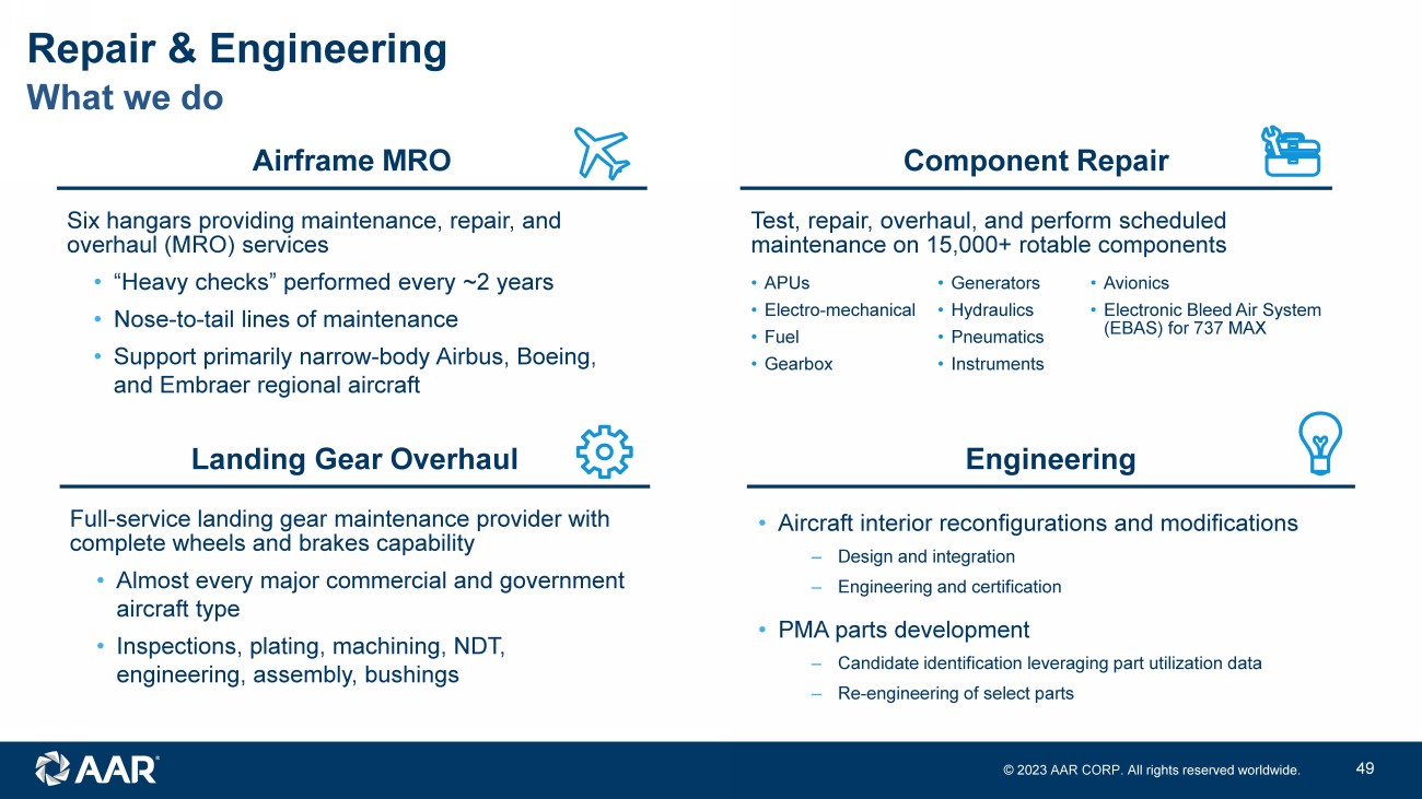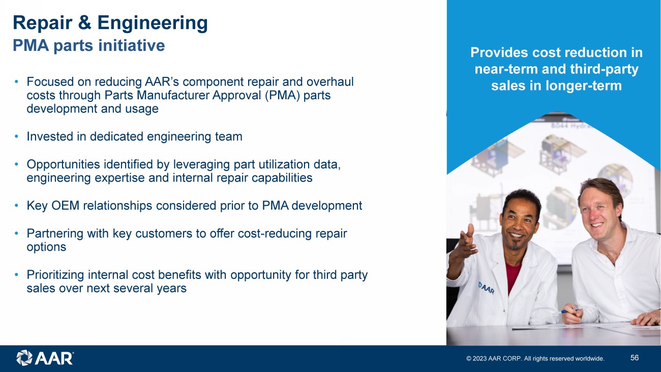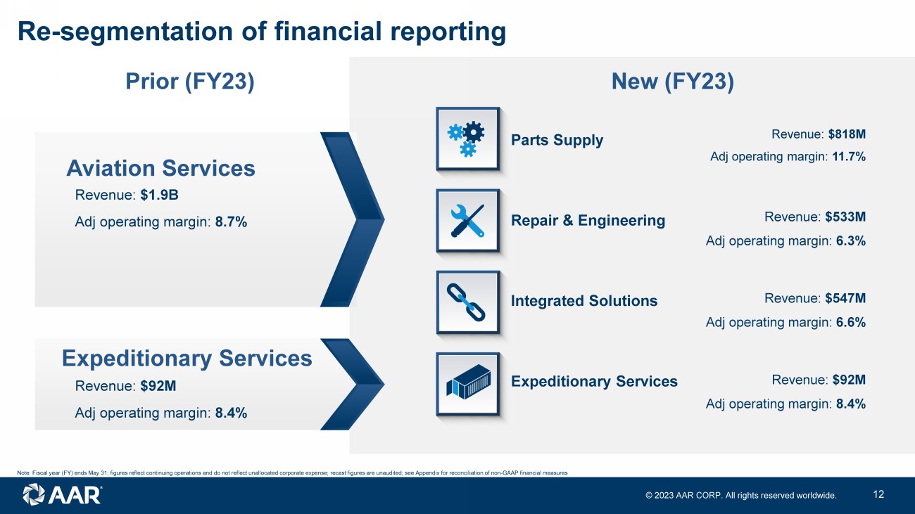 © 2023 AAR CORP. All rights reserved worldwide. 11 • Focused on reducing AAR’s component repair and overhaul costs through Parts Manufacturer Approval (PMA) parts development and usage • Invested in dedicated engineering team • Opportunities identified by leveraging part utilization data, engineering expertise and internal repair capabilities • Key OEM relationships considered prior to PMA development • Partnering with key customers to offer cost - reducing repair options • Prioritizing internal cost benefits with opportunity for third party sales over next several years PMA parts initiative Repair & Engineering Provides cost reduction in near - term and third - party sales in longer - term
