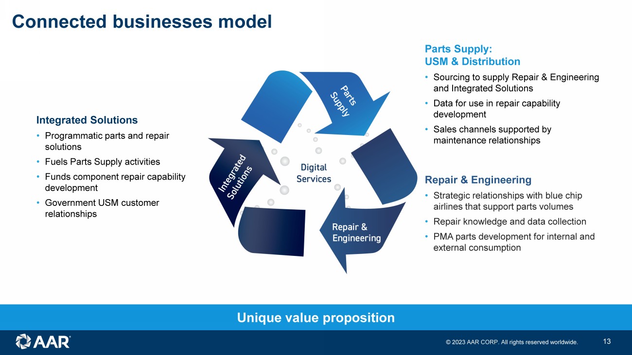 © 2023 AAR CORP. All rights reserved worldwide. 12 Aviation Services Re - segmentation of financial reporting Expeditionary Services Prior (FY23) New (FY23) Revenue: $1.9B Adj operating margin: 8.7% Revenue: $92M Adj operating margin: 8.4% Parts Supply Revenue: $818M Adj operating margin: 11.7% Repair & Engineering Integrated Solutions Expeditionary Services Revenue: $533M Adj operating margin: 6.3% Revenue: $547M Adj operating margin: 6.6% Revenue: $92M Adj operating margin: 8.4% Note: Fiscal year (FY) ends May 31; figures reflect continuing operations and do not reflect unallocated corporate expense; r eca st figures are unaudited; see Appendix for reconciliation of non - GAAP financial measures