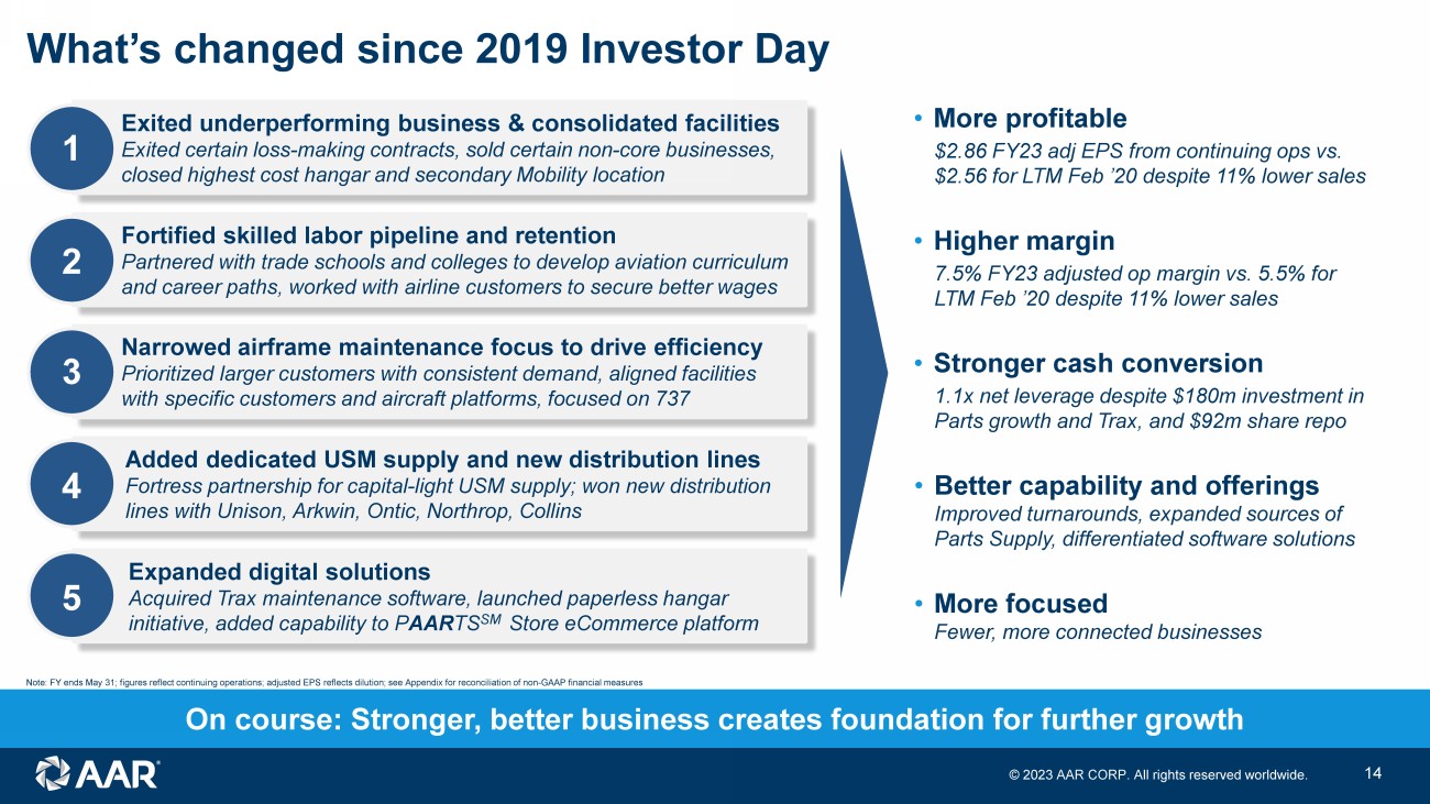 © 2023 AAR CORP. All rights reserved worldwide. 13 Connected businesses model Parts Supply: USM & Distribution • Sourcing to supply Repair & Engineering and Integrated Solutions • Data for use in repair capability development • Sales channels supported by maintenance relationships Repair & Engineering • Strategic relationships with blue chip airlines that support parts volumes • Repair knowledge and data collection • PMA parts development for internal and external consumption Integrated Solutions • Programmatic parts and repair solutions • Fuels Parts Supply activities • Funds component repair capability development • Government USM customer relationships Unique value proposition