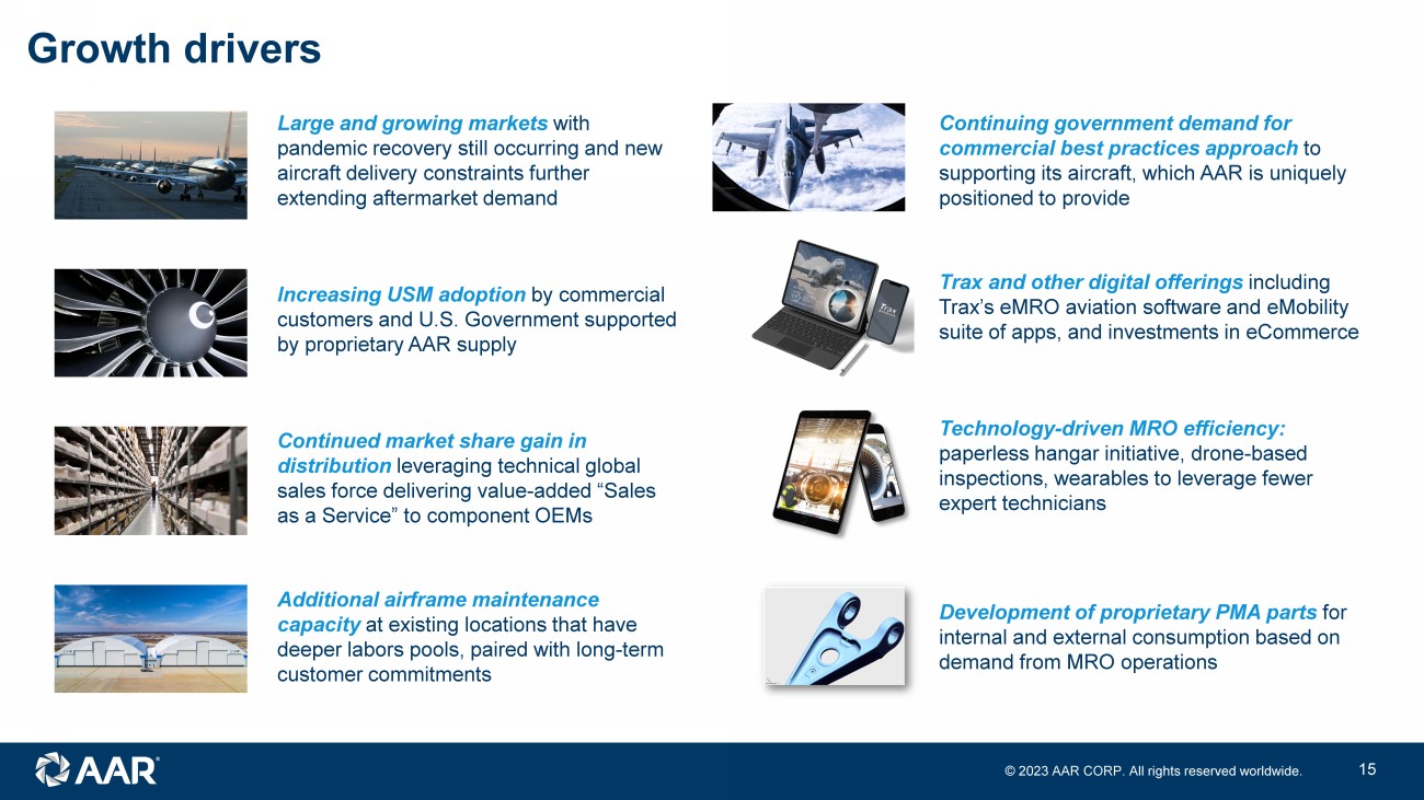 © 2023 AAR CORP. All rights reserved worldwide. 14 What’s changed since 2019 Investor Day 1 2 3 4 Added dedicated USM supply and new distribution lines Fortress partnership for capital - light USM supply; won new distribution lines with Unison, Arkwin , Ontic, Northrop, Collins On course: Stronger, better business creates foundation for further growth • More profitable $2.86 FY23 adj EPS from continuing ops vs. $2.56 for LTM Feb ’20 despite 11% lower sales • Higher margin 7.5% FY23 adjusted op margin vs. 5.5% for LTM Feb ’20 despite 11% lower sales • Stronger cash conversion 1.1x net leverage despite $180m investment in Parts growth and Trax , and $92m share repo • Better capability and offerings Improved turnarounds, expanded sources of Parts Supply, differentiated software solutions • More focused Fewer, more connected businesses 5 Expanded digital solutions Acquired Trax maintenance software, launched paperless hangar initiative, added capability to P AAR TS SM Store eCommerce platform Narrowed airframe maintenance focus to drive efficiency Prioritized larger customers with consistent demand, aligned facilities with specific customers and aircraft platforms, focused on 737 Fortified skilled labor pipeline and retention Partnered with trade schools and colleges to develop aviation curriculum and career paths, worked with airline customers to secure better wages Exited underperforming business & consolidated facilities Exited certain loss - making contracts, sold certain non - core businesses, closed highest cost hangar and secondary Mobility location Note: FY ends May 31; figures reflect continuing operations; adjusted EPS reflects dilution; see Appendix for reconciliation of non - GAAP financial measures