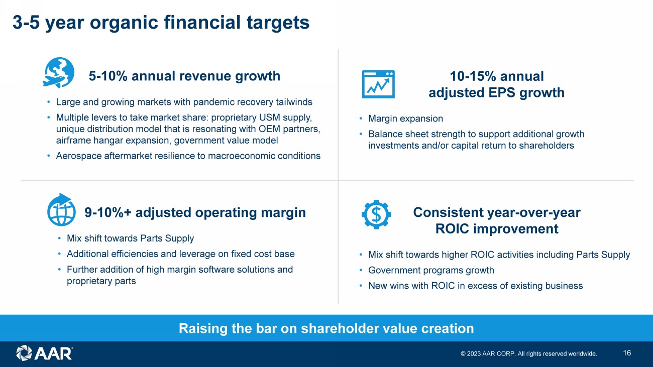 © 2023 AAR CORP. All rights reserved worldwide. 15 Growth drivers Large and growing markets with pandemic recovery still occurring and new aircraft delivery constraints further extending aftermarket demand Continuing government demand for commercial best practices approach to supporting its aircraft, which AAR is uniquely positioned to provide Increasing USM adoption by commercial customers and U.S. Government supported by proprietary AAR supply Trax and other digital offerings including Trax’s eMRO aviation software and eMobility suite of apps, and investments in eCommerce Continued market share gain in distribution leveraging technical global sales force delivering value - added “Sales as a Service” to component OEMs Technology - driven MRO efficiency: paperless hangar initiative, drone - based inspections, wearables to leverage fewer expert technicians Additional airframe maintenance capacity at existing locations that have deeper labors pools, paired with long - term customer commitments Development of proprietary PMA parts for internal and external consumption based on demand from MRO operations