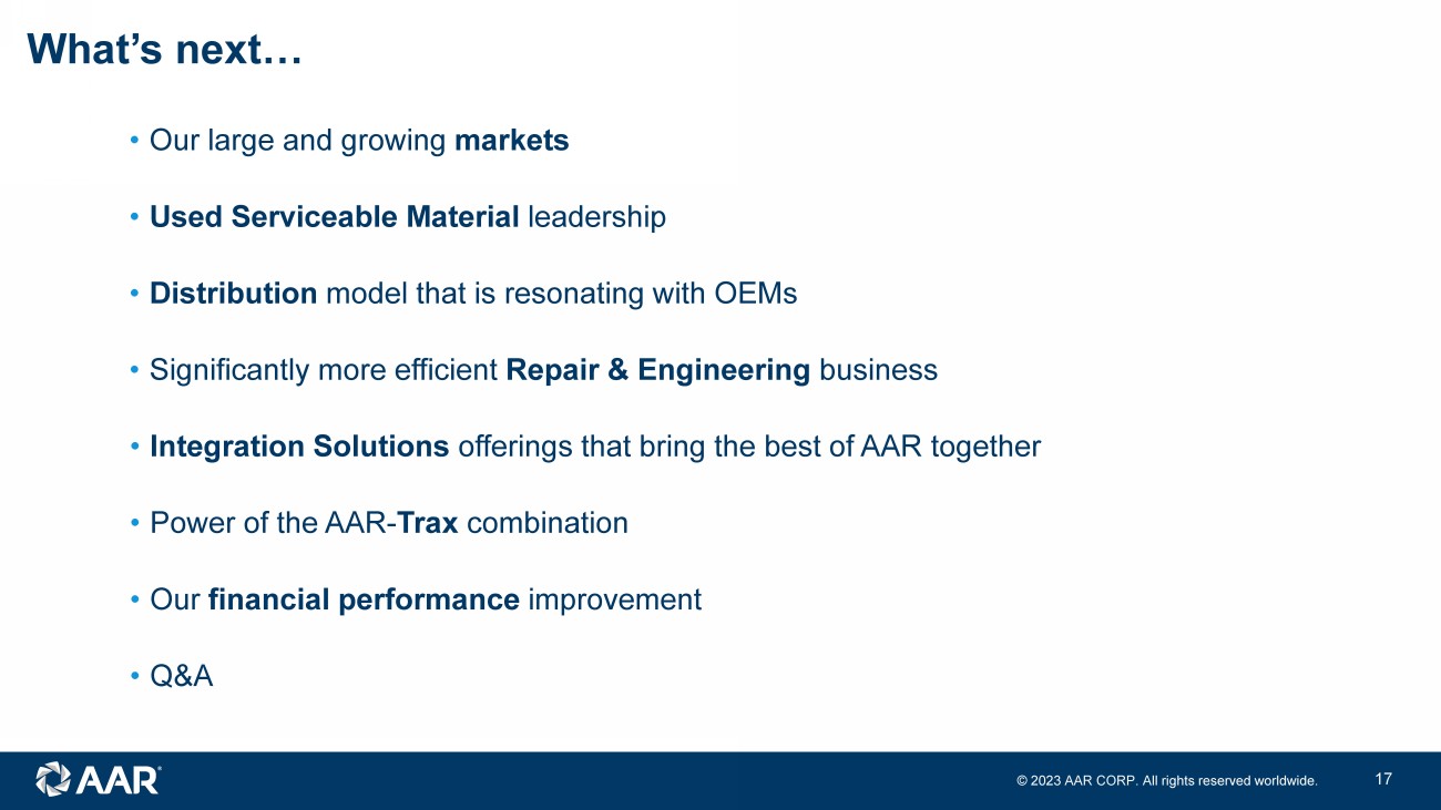 © 2023 AAR CORP. All rights reserved worldwide. 16 3 - 5 year organic financial targets 5 - 10% annual revenue growth • Large and growing markets with pandemic recovery tailwinds • Multiple levers to take market share: proprietary USM supply, unique distribution model that is resonating with OEM partners, airframe hangar expansion, government value model • Aerospace aftermarket resilience to macroeconomic conditions Raising the bar on shareholder value creation 9 - 10%+ adjusted operating margin • Mix shift towards Parts Supply • Additional efficiencies and leverage on fixed cost base • Further addition of high margin software solutions and proprietary parts 10 - 15% annual adjusted EPS growth • Margin expansion • Balance sheet strength to support additional growth investments and/or capital return to shareholders Consistent year - over - year ROIC improvement • Mix shift towards higher ROIC activities including Parts Supply • Government programs growth • New wins with ROIC in excess of existing business