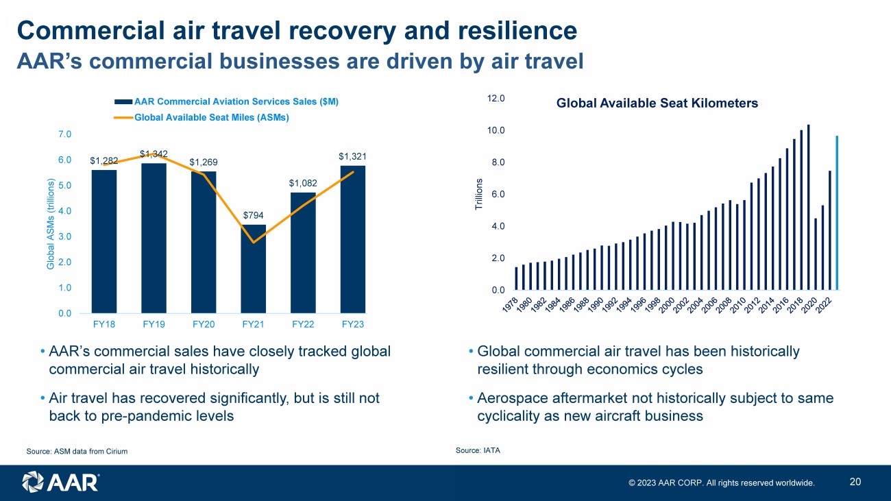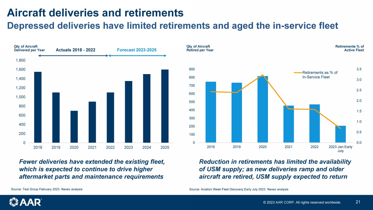 © 2023 AAR CORP. All rights reserved worldwide. 20 Commercial air travel recovery and resilience • AAR’s commercial sales have closely tracked global commercial air travel historically • Air travel has recovered significantly, but is still not back to pre - pandemic levels Source: ASM data from Cirium Source: IATA AAR’s commercial businesses are driven by air travel • Global commercial air travel has been historically resilient through economics cycles • Aerospace aftermarket not historically subject to same cyclicality as new aircraft business $1,282 $1,342 $1,269 $794 $1,082 $1,321 $0 $200 $400 $600 $800 $1,000 $1,200 $1,400 $1,600 0.0 1.0 2.0 3.0 4.0 5.0 6.0 7.0 FY18 FY19 FY20 FY21 FY22 FY23 Global ASMs (trillions) AAR Commercial Aviation Services Sales ($M) Global Available Seat Miles (ASMs) 0.0 2.0 4.0 6.0 8.0 10.0 12.0 Trillions Global Available Seat Kilometers