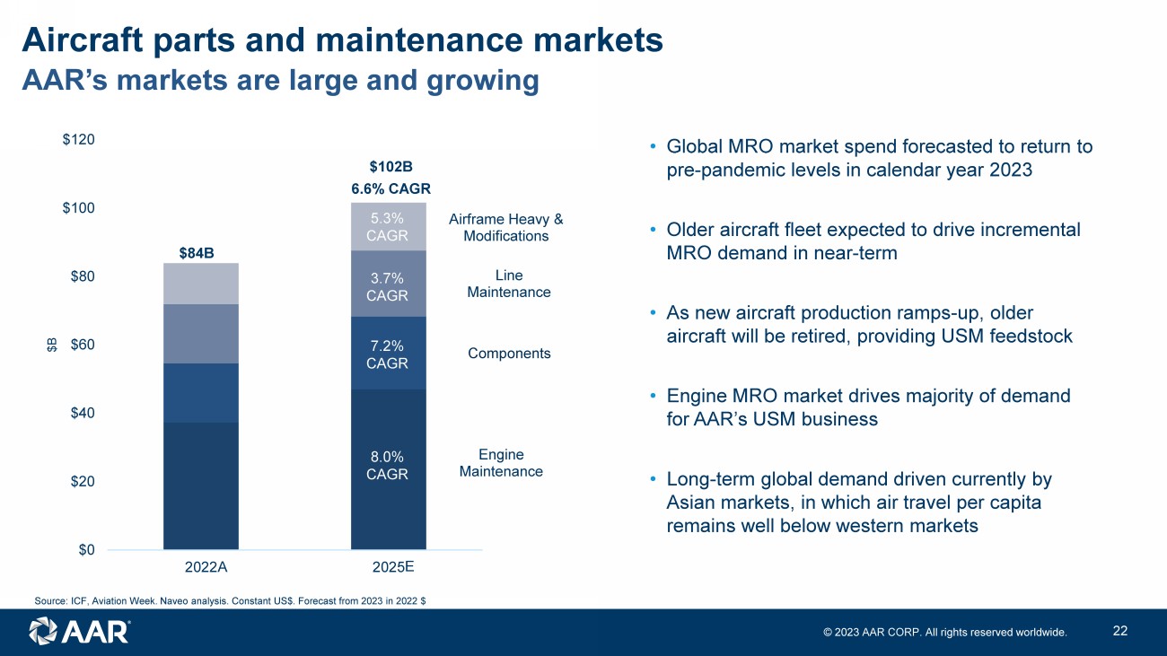 © 2023 AAR CORP. All rights reserved worldwide. 21 0 200 400 600 800 1,000 1,200 1,400 1,600 1,800 2018 2019 2020 2021 2022 2023 2024 2025 Forecast 2023 - 2025 Actuals 2018 - 2022 Qty of Aircraft Retired per Year Retirements % of Active Fleet Qty of Aircraft Delivered per Year 0.0 0.5 1.0 1.5 2.0 2.5 3.0 3.5 0 100 200 300 400 500 600 700 800 900 2018 2019 2020 2021 2022 2023 Jan-Early July Retirements as % of In-Service Fleet Source: Teal Group February 2023. Naveo analysis Source: Aviation Week Fleet Discovery Early July 2023. Naveo analysis Depressed deliveries have limited retirements and aged the in - service fleet Aircraft deliveries and retirements Fewer deliveries have extended the existing fleet, which is expected to continue to drive higher aftermarket parts and maintenance requirements Reduction in retirements has limited the availability of USM supply; as new deliveries ramp and older aircraft are retired, USM supply expected to return