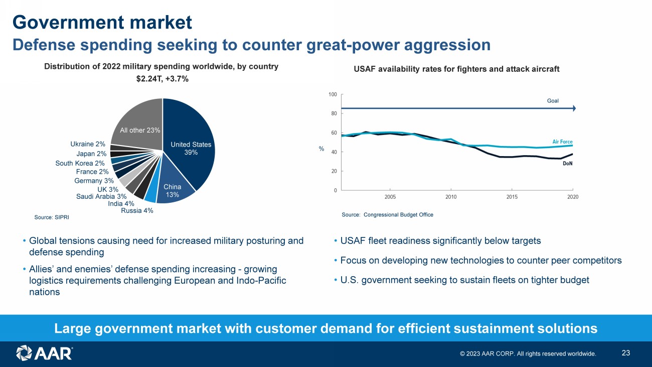 © 2023 AAR CORP. All rights reserved worldwide. 22 AAR’s markets are large and growing • Global MRO market spend forecasted to return to pre - pandemic levels in calendar year 2023 • Older aircraft fleet expected to drive incremental MRO demand in near - term • As new aircraft production ramps - up, older aircraft will be retired, providing USM feedstock • Engine MRO market drives majority of demand for AAR’s USM business • Long - term global demand driven currently by Asian markets, in which air travel per capita remains well below western markets Aircraft parts and maintenance markets Engine Maintenance Components Line Maintenance Airframe Heavy & Modifications $0 $20 $40 $60 $80 $100 $120 2022 2025 $B $102B 6.6% CAGR $84B 5.3% CAGR 3.7% CAGR 7.2% CAGR 8.0% CAGR A E Source: ICF, Aviation Week. Naveo analysis. Constant US$. Forecast from 2023 in 2022 $