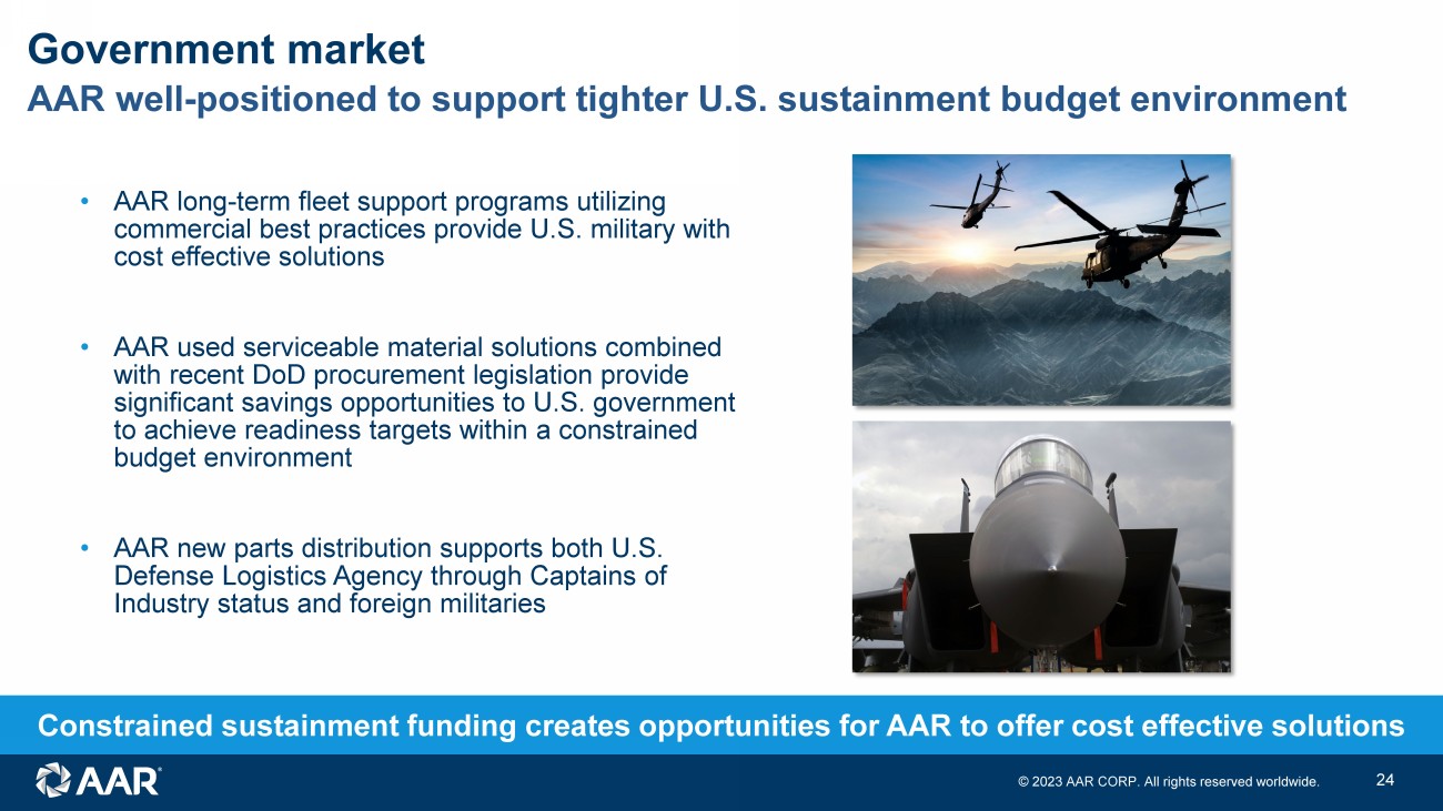 © 2023 AAR CORP. All rights reserved worldwide. 23 Government market • Global tensions causing need for increased military posturing and defense spending • Allies’ and enemies’ defense spending increasing - growing logistics requirements challenging European and Indo - Pacific nations Source: Congressional Budget Office Defense spending seeking to counter great - power aggression • USAF fleet readiness significantly below targets • Focus on developing new technologies to counter peer competitors • U.S. government seeking to sustain fleets on tighter budget Source: SIPRI % Goal Large government market with customer demand for efficient sustainment solutions Distribution of 2022 military spending worldwide, by country $2.24T, +3.7% USAF availability rates for fighters and attack aircraft United States 39% China 13% Russia 4% India 4% Saudi Arabia 3% UK 3% Germany 3% France 2% South Korea 2% Japan 2% Ukraine 2% All other 23%