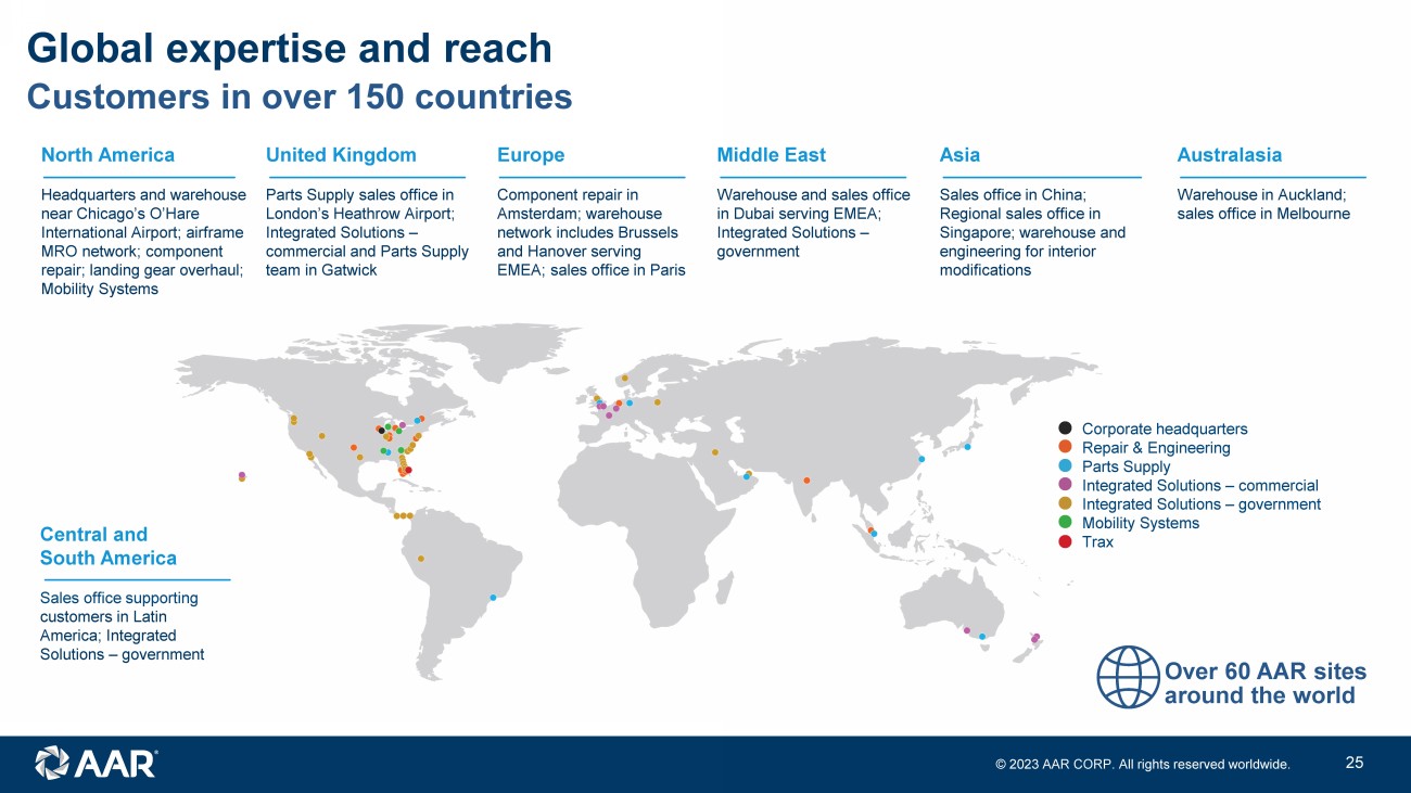 © 2023 AAR CORP. All rights reserved worldwide. 24 Government market AAR well - positioned to support tighter U.S. sustainment budget environment • AAR long - term fleet support programs utilizing commercial best practices provide U.S. military with cost effective solutions • AAR used serviceable material solutions combined with recent DoD procurement legislation provide significant savings opportunities to U.S. government to achieve readiness targets within a constrained budget environment • AAR new parts distribution supports both U.S. Defense Logistics Agency through Captains of Industry status and foreign militaries Constrained sustainment funding creates opportunities for AAR to offer cost effective solutions