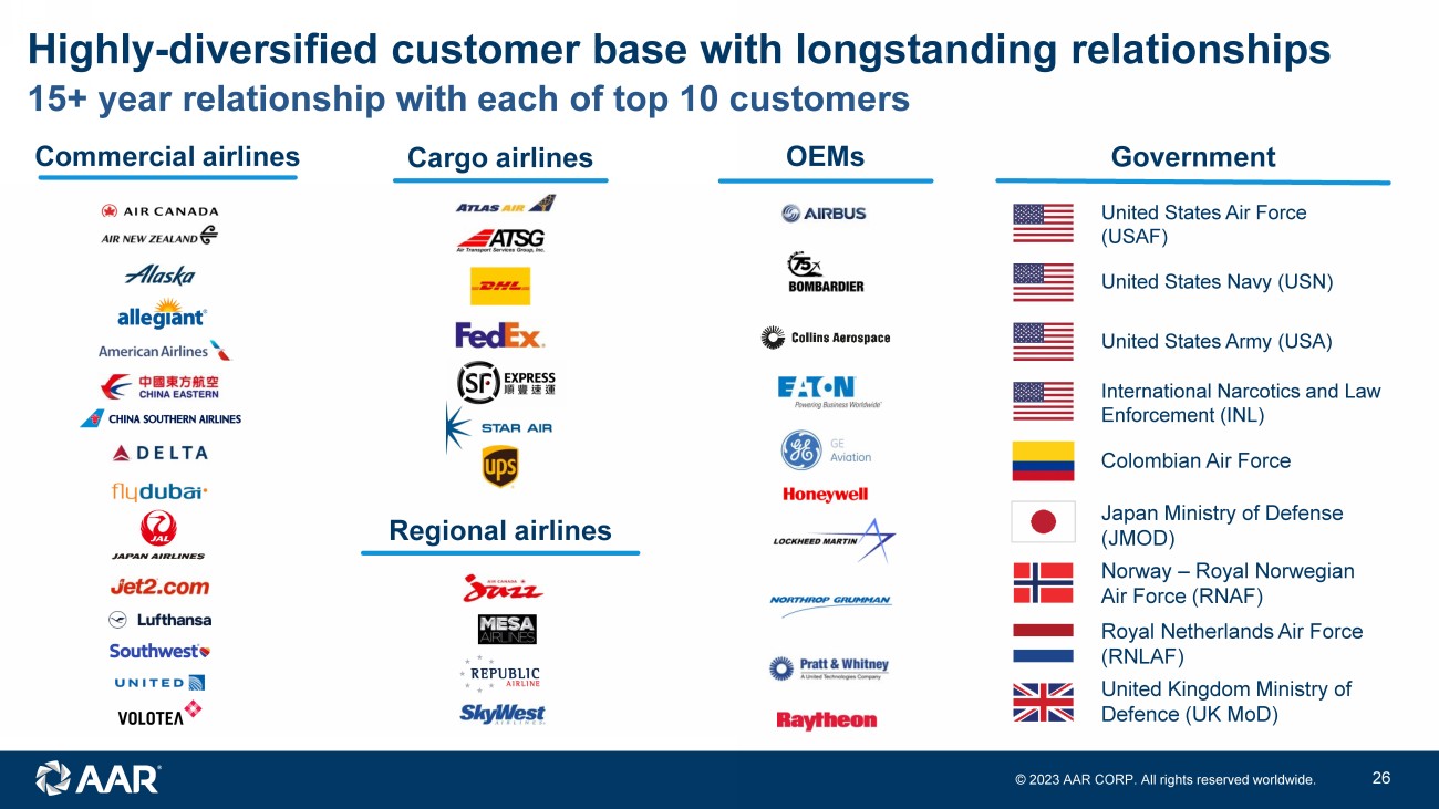 © 2023 AAR CORP. All rights reserved worldwide. 25 North America Headquarters and warehouse near Chicago’s O’Hare International Airport; airframe MRO network; component repair; landing gear overhaul; Mobility Systems United Kingdom Parts Supply sales office in London’s Heathrow Airport; Integrated Solutions – commercial and Parts Supply team in Gatwick Europe Component repair in Amsterdam; warehouse network includes Brussels and Hanover serving EMEA; sales office in Paris Asia Sales office in China; Regional sales office in Singapore; warehouse and engineering for interior modifications Middle East Warehouse and sales office in Dubai serving EMEA; Integrated Solutions – government Australasia Warehouse in Auckland; sales office in Melbourne Central and South America Sales office supporting customers in Latin America; Integrated Solutions – government Over 60 AAR sites around the world Corporate headquarters Repair & Engineering Parts Supply Integrated Solutions – commercial Integrated Solutions – government Mobility Systems Trax Global expertise and reach Customers in over 150 countries