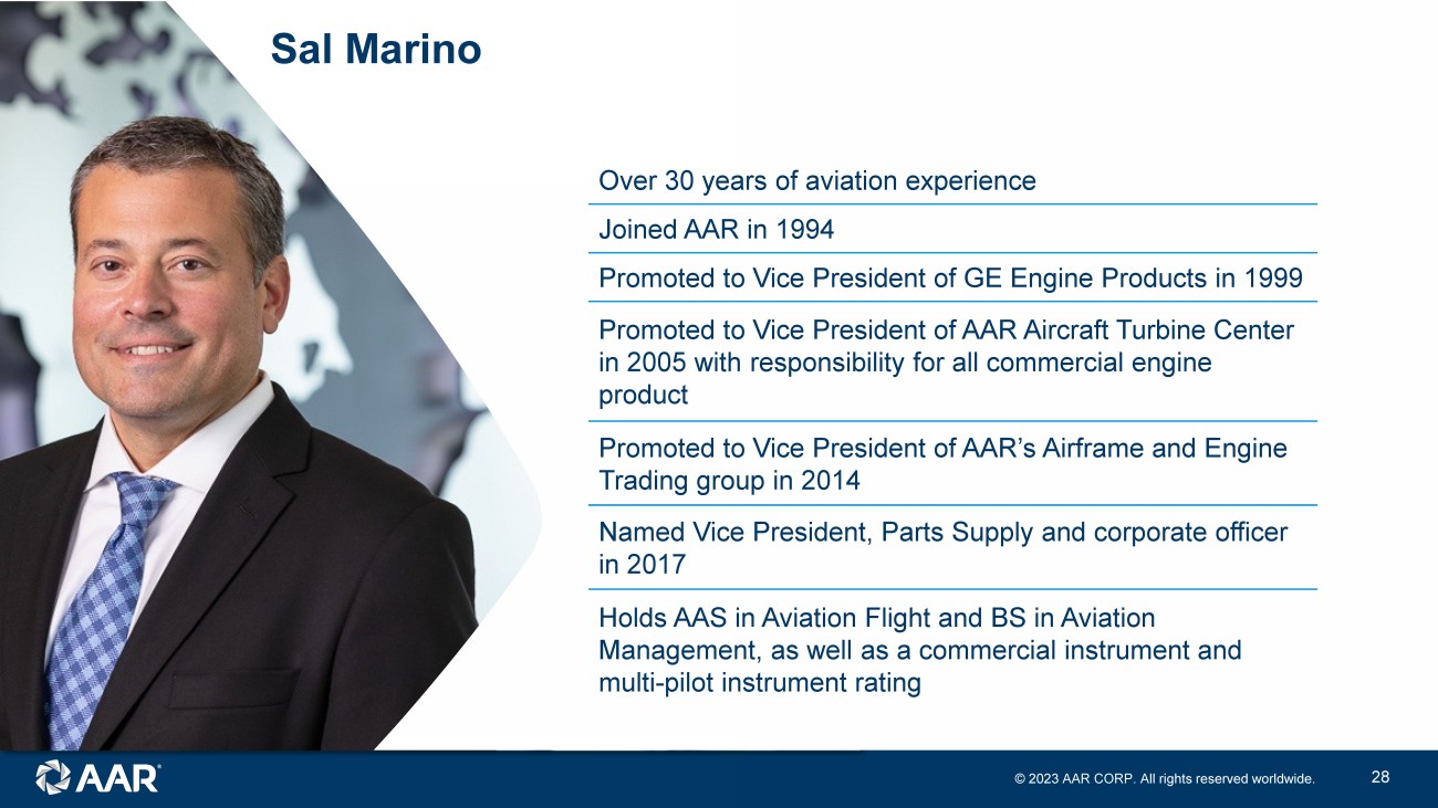 © 2023 AAR CORP. All rights reserved worldwide. 27 Parts Supply: Used Serviceable Material Sal Marino Senior Vice President, Used Serviceable Material