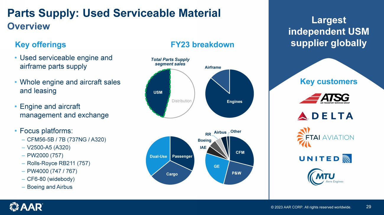 © 2023 AAR CORP. All rights reserved worldwide. 28 Sal Marino Over 30 years of aviation experience Joined AAR in 1994 Promoted to Vice President of GE Engine Products in 1999 Promoted to Vice President of AAR Aircraft Turbine Center in 2005 with responsibility for all commercial engine product Promoted to Vice President of AAR’s Airframe and Engine Trading group in 2014 Named Vice President, Parts Supply and corporate officer in 2017 Holds AAS in Aviation Flight and BS in Aviation Management, as well as a commercial instrument and multi - pilot instrument rating