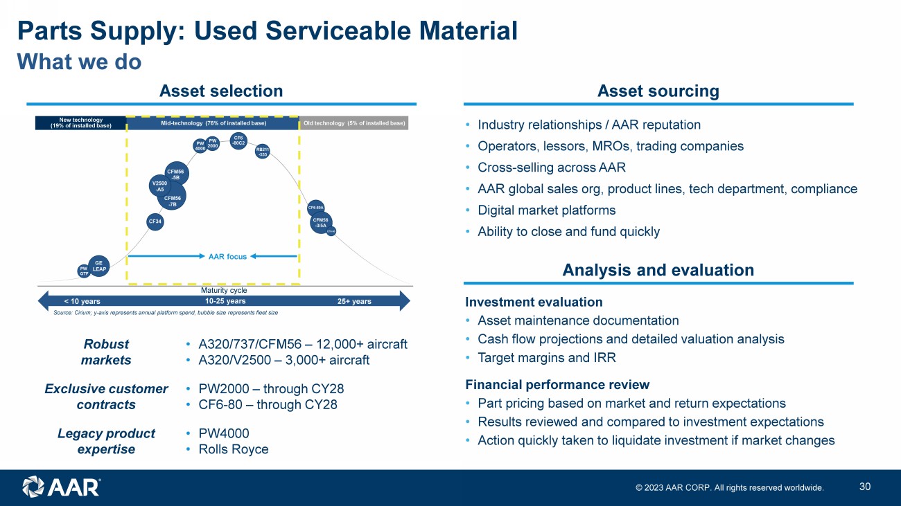 © 2023 AAR CORP. All rights reserved worldwide. 29 Overview Parts Supply: Used Serviceable Material Key offerings • Used serviceable engine and airframe parts supply • Whole engine and aircraft sales and leasing • Engine and aircraft management and exchange • Focus platforms: ‒ CFM56 - 5B / 7B (737NG / A320) ‒ V2500 - A5 (A320) ‒ PW2000 (757) ‒ Rolls - Royce RB211 (757) ‒ PW4000 (747 / 767) ‒ CF6 - 80 (widebody) ‒ Boeing and Airbus Largest independent USM supplier globally Key customers Distribution USM Engines Airframe CFM P&W GE IAE Boeing RR Airbus Other Passenger Cargo Dual - Use FY23 breakdown Total Parts Supply segment sales