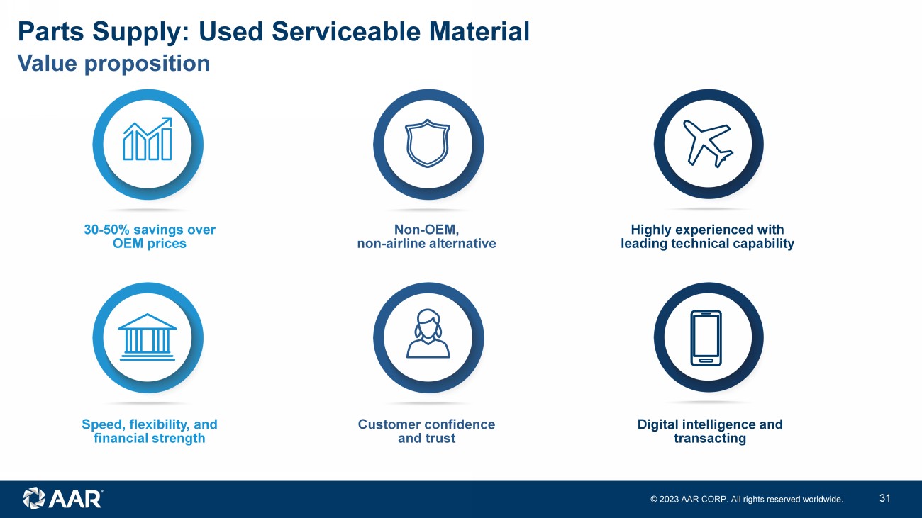 © 2023 AAR CORP. All rights reserved worldwide. 30 Asset selection What we do Parts Supply: Used Serviceable Material • Industry relationships / AAR reputation • Operators, lessors, MROs, trading companies • Cross - selling across AAR • AAR global sales org, product lines, tech department, compliance • Digital market platforms • Ability to close and fund quickly Robust markets • A320/737/CFM56 – 12,000+ aircraft • A320/V2500 – 3,000+ aircraft Exclusive customer contracts • PW2000 – through CY28 • CF6 - 80 – through CY28 Legacy product expertise • PW4000 • Rolls Royce Investment evaluation • Asset maintenance documentation • Cash flow projections and detailed valuation analysis • Target margins and IRR Financial performance review • Part pricing based on market and return expectations • Results reviewed and compared to investment expectations • Action quickly taken to liquidate investment if market changes Source: Cirium ; y - axis represents annual platform spend, bubble size represents fleet size New technology (19% of installed base) Mid - technology (76% of installed base) Old technology (5% of installed base) < 10 years 10 - 25 years 25+ years Maturity cycle AAR focus Asset sourcing Analysis and evaluation