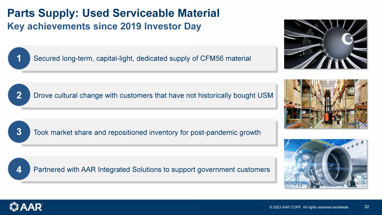 © 2023 AAR CORP. All rights reserved worldwide. 31 Value proposition Parts Supply: Used Serviceable Material 30 - 50% savings over OEM prices Non - OEM, non - airline alternative Highly experienced with leading technical capability Speed, flexibility, and financial strength Customer confidence and trust Digital intelligence and transacting
