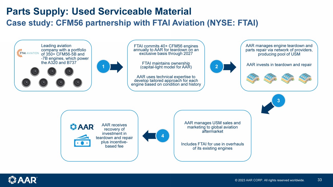 © 2023 AAR CORP. All rights reserved worldwide. 32 Key achievements since 2019 Investor Day Parts Supply: Used Serviceable Material 1 2 3 4 Secured long - term, capital - light, dedicated supply of CFM56 material Drove cultural change with customers that have not historically bought USM Partnered with AAR Integrated Solutions to support government customers Took market share and repositioned inventory for post - pandemic growth