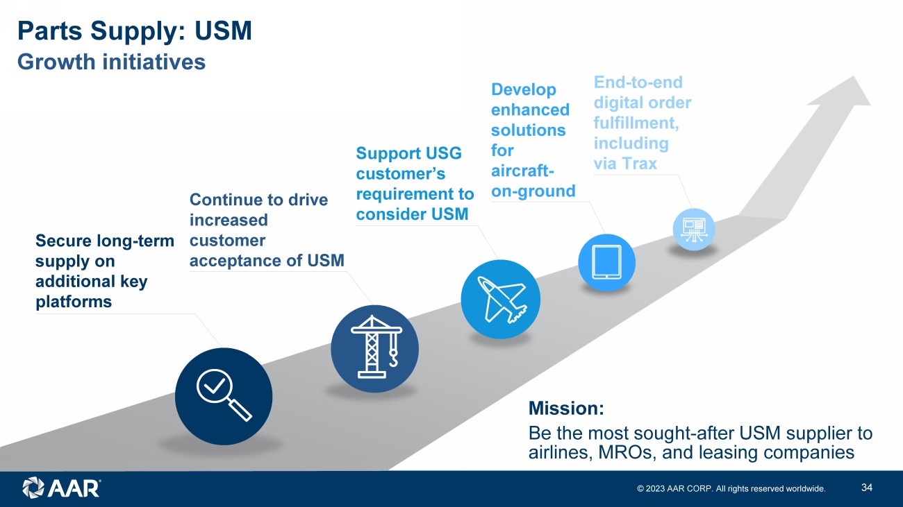 © 2023 AAR CORP. All rights reserved worldwide. 34 Growth initiatives Parts Supply: USM Secure long - term supply on additional key platforms Continue to drive increased customer acceptance of USM Support USG customer’s requirement to consider USM Develop enhanced solutions for aircraft - on - ground End - to - end digital order fulfillment, including via Trax Mission: Be the most sought - after USM supplier to airlines, MROs, and leasing companies
