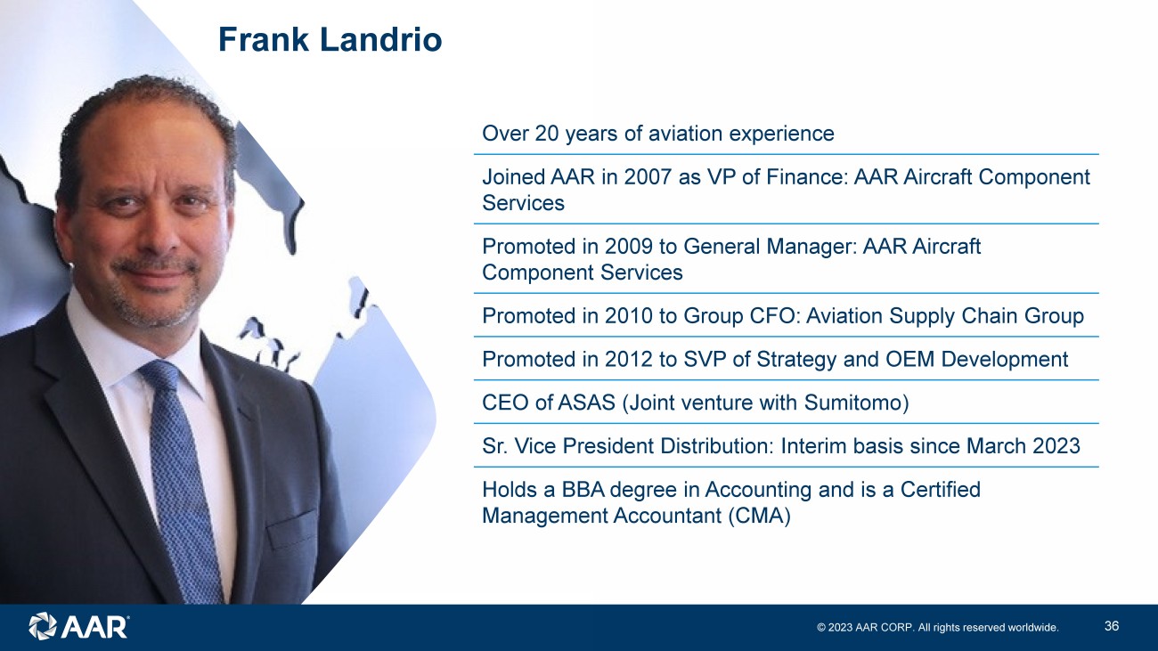 © 2023 AAR CORP. All rights reserved worldwide. 35 Parts Supply: Distribution Frank Landrio Senior Vice President, Distribution (Interim)