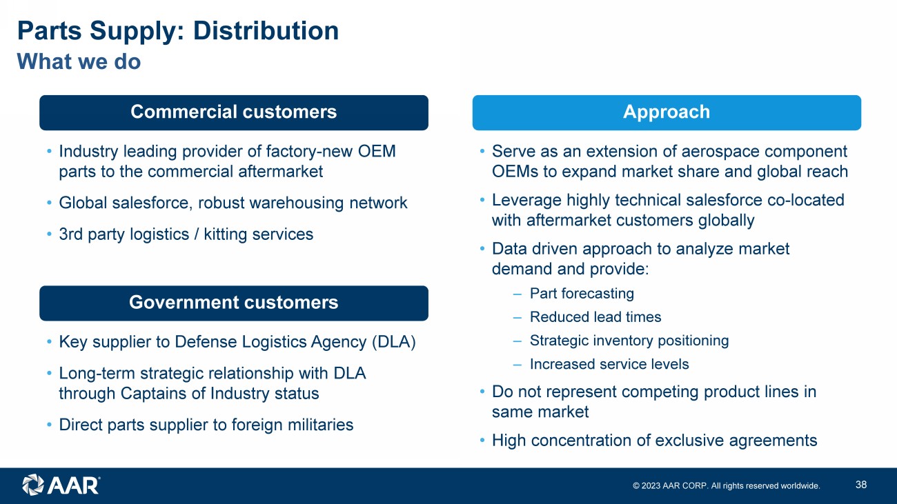 © 2023 AAR CORP. All rights reserved worldwide. 37 • Distribution on behalf of components OEMs to: ‒ Aircraft operators ‒ Government customers ‒ MROs • Third - party logistics / kitting Key customers 250,000 part numbers sold to over 2,500 customers Commercial Gov't BA/ GA Overview Parts Supply: Distribution Key offerings Narrow Body Wide Body Regional Distribution USM FY23 breakdown Total Parts Supply segment sales Commercial sales Distribution sales