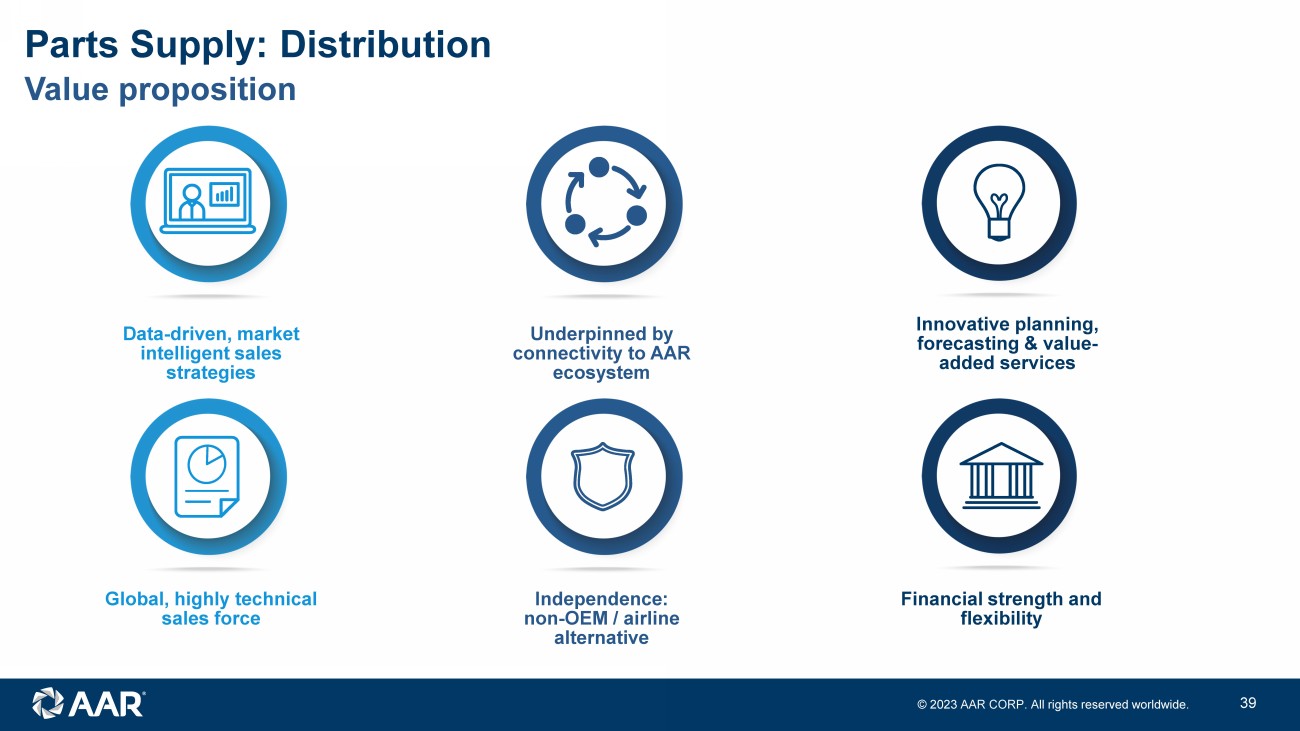 © 2023 AAR CORP. All rights reserved worldwide. 38 What we do Parts Supply: Distribution Commercial customers Government customers Approach • Industry leading provider of factory - new OEM parts to the commercial aftermarket • Global salesforce, robust warehousing network • 3rd party logistics / kitting services • Key supplier to Defense Logistics Agency (DLA) • Long - term strategic relationship with DLA through Captains of Industry status • Direct parts supplier to foreign militaries • Serve as an extension of aerospace component OEMs to expand market share and global reach • Leverage highly technical salesforce co - located with aftermarket customers globally • Data driven approach to analyze market demand and provide: ‒ Part forecasting ‒ Reduced lead times ‒ Strategic inventory positioning ‒ Increased service levels • Do not represent competing product lines in same market • High concentration of exclusive agreements