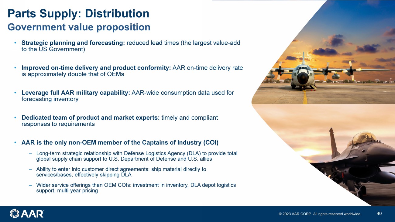 © 2023 AAR CORP. All rights reserved worldwide. 39 Value proposition Parts Supply: Distribution Data - driven, market intelligent sales strategies Underpinned by connectivity to AAR ecosystem Innovative planning, forecasting & value - added services Global, highly technical sales force Independence: non - OEM / airline alternative Financial strength and flexibility