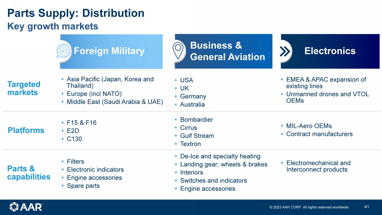 © 2023 AAR CORP. All rights reserved worldwide. 40 • Strategic planning and forecasting: reduced lead times (the largest value - add to the US Government) • Improved on - time delivery and product conformity: AAR on - time delivery rate is approximately double that of OEMs • Leverage full AAR military capability: AAR - wide consumption data used for forecasting inventory • Dedicated team of product and market experts: timely and compliant responses to requirements • AAR is the only non - OEM member of the Captains of Industry (COI) ‒ Long - term strategic relationship with Defense Logistics Agency (DLA) to provide total global supply chain support to U.S. Department of Defense and U.S. allies ‒ Ability to enter into customer direct agreements: ship material directly to services/bases, effectively skipping DLA ‒ Wider service offerings than OEM COIs: investment in inventory, DLA depot logistics support, multi - year pricing Parts Supply: Distribution Government value proposition