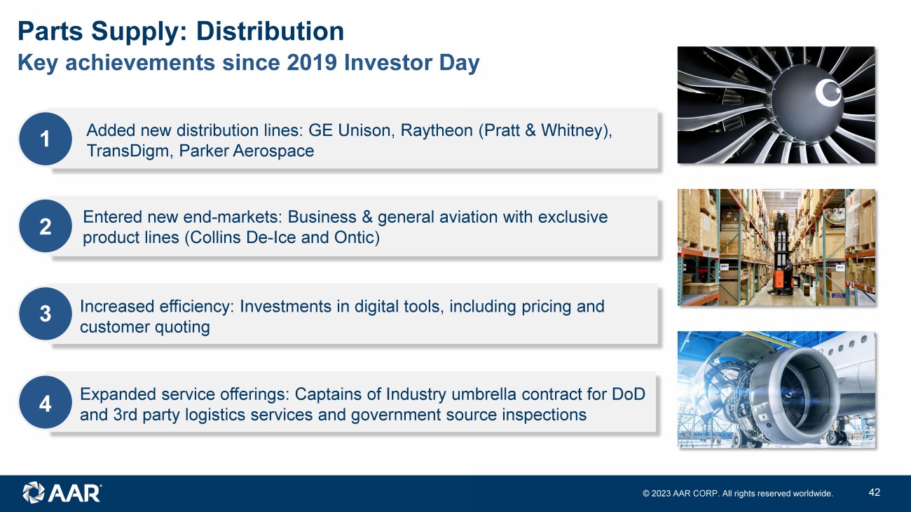 © 2023 AAR CORP. All rights reserved worldwide. 41 Key growth markets Parts Supply: Distribution Electronics Foreign Military Business & General Aviation Targeted markets Parts & capabilities • Asia Pacific (Japan, Korea and Thailand) • Europe (incl NATO) • Middle East (Saudi Arabia & UAE) Platforms • F15 & F16 • E2D • C130 • Filters • Electronic indicators • Engine accessories • Spare parts • EMEA & APAC expansion of existing lines • Unmanned drones and VTOL OEMs • MIL - Aero OEMs • Contract manufacturers • Electromechanical and Interconnect products • USA • UK • Germany • Australia • Bombardier • Cirrus • Gulf Stream • Textron • De - Ice and specialty heating • Landing gear; wheels & brakes • Interiors • Switches and indicators • Engine accessories