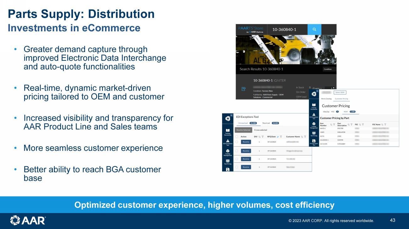 © 2023 AAR CORP. All rights reserved worldwide. 43 Optimized customer experience, higher volumes, cost efficiency • Greater demand capture through improved Electronic Data Interchange and auto - quote functionalities • Real - time, dynamic market - driven pricing tailored to OEM and customer • Increased visibility and transparency for AAR Product Line and Sales teams • More seamless customer experience • Better ability to reach BGA customer base Investments in eCommerce Parts Supply: Distribution