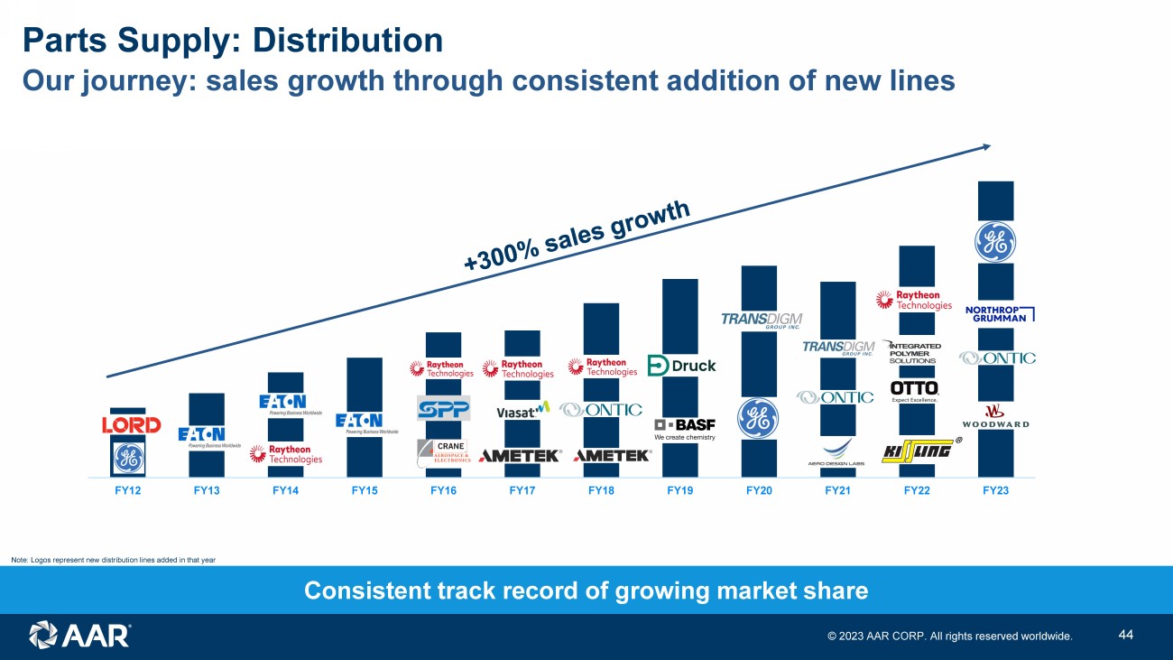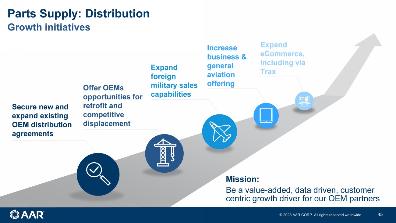 © 2023 AAR CORP. All rights reserved worldwide. 44 FY12 FY13 FY14 FY15 FY16 FY17 FY18 FY19 FY20 FY21 FY22 FY23 Our journey: sales growth through consistent addition of new lines Parts Supply: Distribution Consistent track record of growing market share Note: Logos represent new distribution lines added in that year