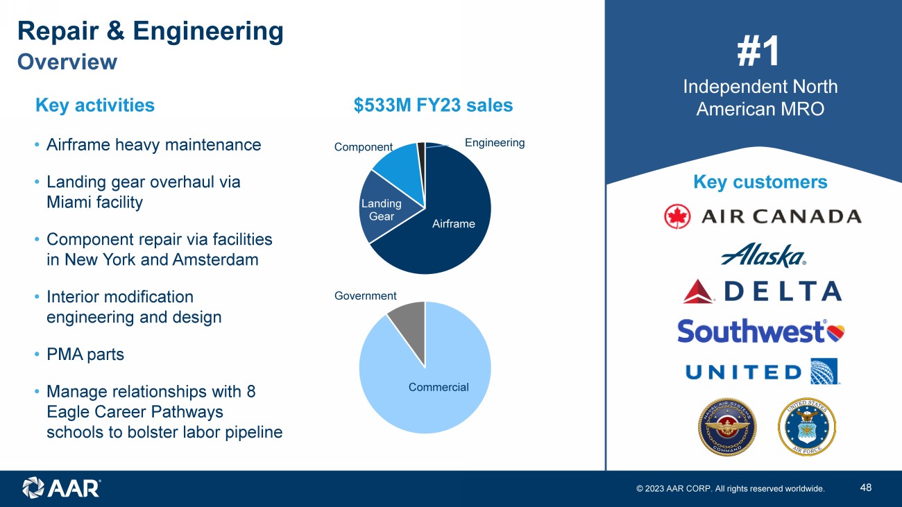 © 2023 AAR CORP. All rights reserved worldwide. 47 FY23 segment adjusted sales, adjusted operating income and adjusted operating margin Non - GAAP financial measures ($ in millions) Aviation Services Expeditionary Services Corporate/ Other Total Parts Supply Repair & Engineering Integrated Solutions Expeditionary Services Corporate/ Other Total Sales $1,898.8 $91.8 $0.0 $1,990.5 $818.4 $533.4 $546.9 $91.8 $0.0 $1,990.5 Contract termination/restructuring & loss provision, net 0.1 - - 0.1 - - 0.1 - - 0.1 Adjusted sales $1,898.9 $91.8 $0.0 $1,990.6 $818.4 $533.4 $547.0 $91.8 $0.0 $1,990.6 Operating income $159.4 $7.7 ($33.3) $133.9 $93.7 $35.3 $30.5 $7.7 ($33.3) $133.9 Investigation and remediation costs - - 4.7 4.7 - - - - 4.7 4.7 Trax acquisition costs 2.0 - 4.9 7.0 - - 2.0 - 4.9 7.0 Customer bankruptcy and credit charges 1.5 - - 1.5 - - 1.5 - - 1.5 Government subsidies (1.6) - - (1.6) - (1.6) - - - (1.6) Russian bankruptcy court clawback judgement 1.8 - - 1.8 1.8 - - - - 1.8 Contract termination/restructuring & loss provision, net 2.0 - - 2.0 - - 2.0 - - 2.0 Severance and furlough costs 0.0 - 0.1 0.1 - 0.0 - - 0.1 0.1 Costs related to strategic projects - - (0.2) (0.2) - - - - (0.2) (0.2) Adjusted operating income $165.2 $7.7 ($23.7) $149.2 $95.5 $33.7 $36.0 $7.7 ($23.7) $149.2 Adjusted operating margin 8.7% 8.4% 7.5% 11.7% 6.3% 6.6% 8.4% 7.5%