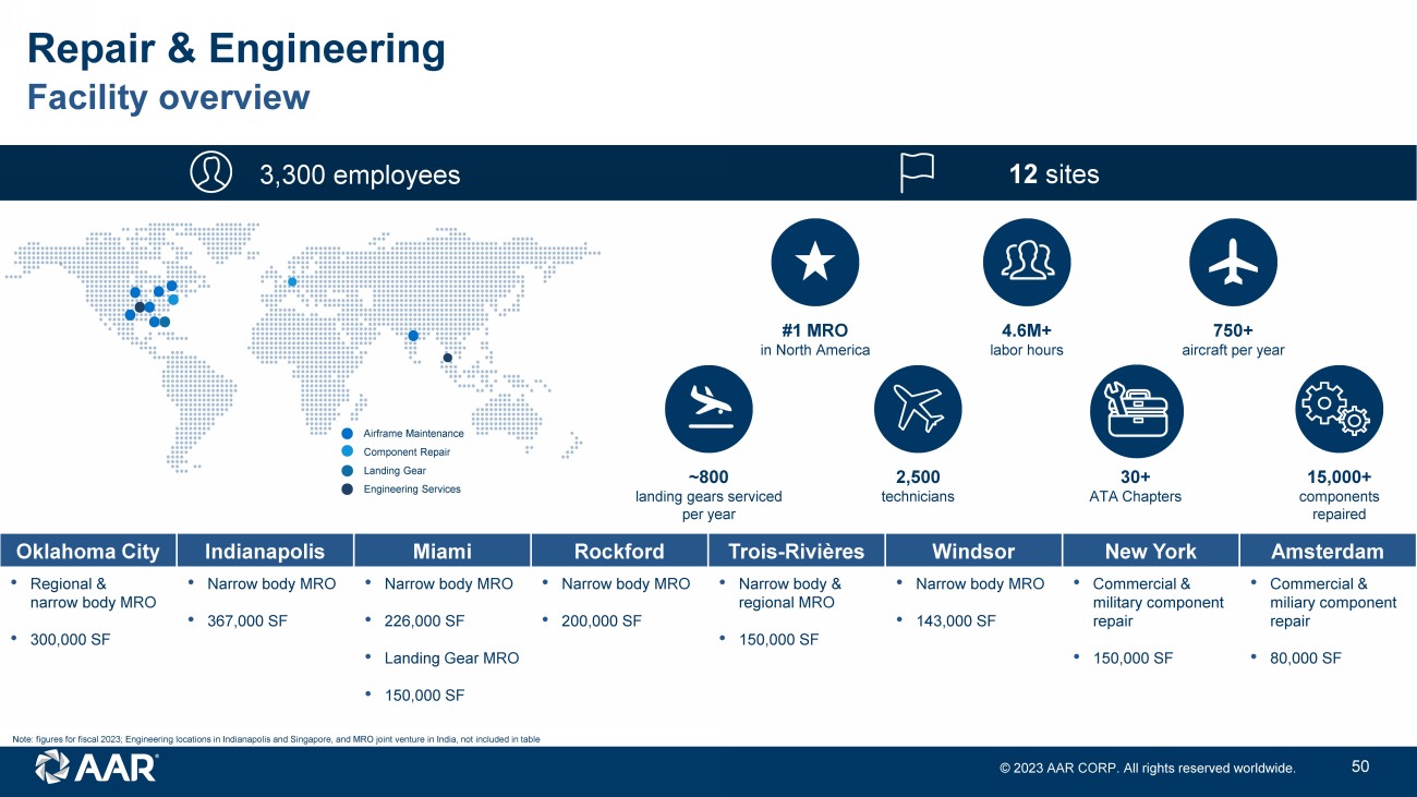 © 2023 AAR CORP. All rights reserved worldwide. 5 3,300 employees 12 sites #1 MRO i n North America 4.6M+ l abor hours 750+ a ircraft per year 2 ,500 technicians ~800 l anding gears serviced per year 30+ ATA Chapters 15,000+ c omponents repaired Airframe Maintenance Component Repair Landing G ear Engineering Services Facility overview Repair & Engineering Oklahoma City Indianapolis Miami Rockford Trois - Rivières Windsor New York Amsterdam • Regional & narrow body MRO • 300,000 SF • Narrow body MRO • 367,000 SF • Narrow body MRO • 226,000 SF • Landing Gear MRO • 150,000 SF • Narrow body MRO • 200,000 SF • Narrow body & regional MRO • 150,000 SF • Narrow body MRO • 143,000 SF • Commercial & military component repair • 150,000 SF • Commercial & miliary component repair • 80,000 SF Note: figures for fiscal 2023; Engineering locations in Indianapolis and Singapore, and MRO joint venture in India, not inclu ded in table