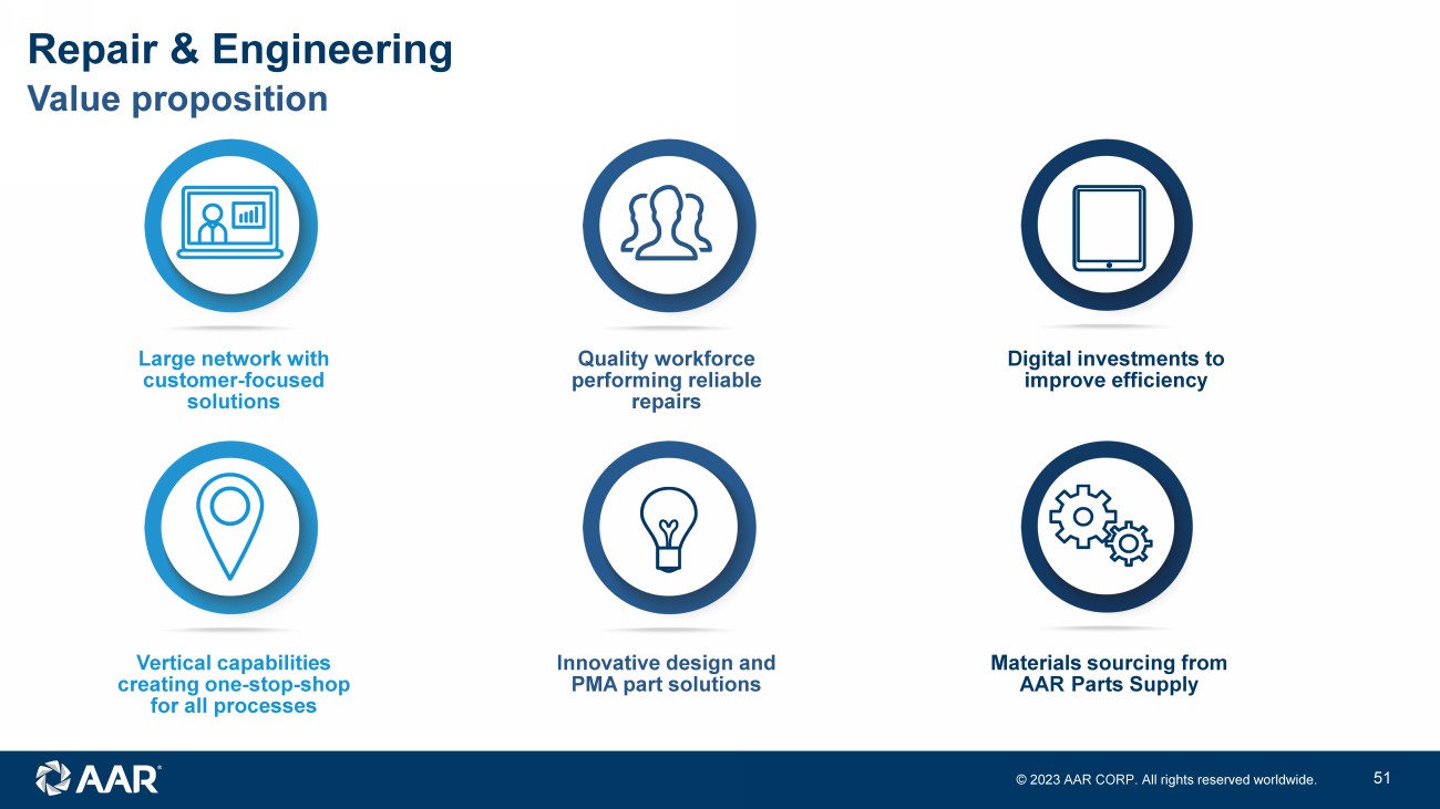 © 2023 AAR CORP. All rights reserved worldwide. 6 Value proposition Repair & Engineering Large network with customer - focused solutions Quality workforce performing reliable repairs Digital investments to improve efficiency Vertical capabilities creating one - stop - shop for all processes Innovative design and PMA part solutions Materials sourcing from AAR Parts Supply
