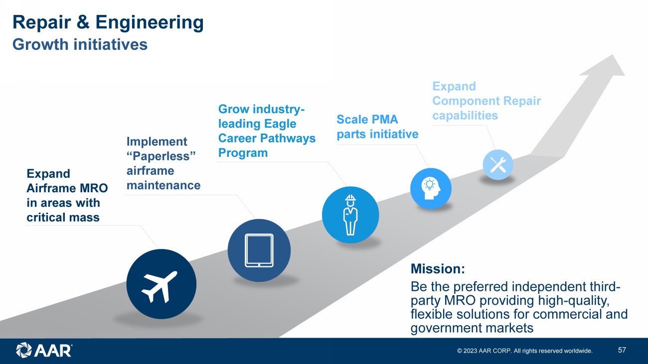 © 2023 AAR CORP. All rights reserved worldwide. 12 Growth initiatives Repair & Engineering Expand Airframe MRO in areas with critical mass Implement “Paperless” airframe maintenance Grow industry - leading Eagle Career Pathways Program Scale PMA parts initiative Expand Component Repair capabilities Mission: Be the preferred independent third - party MRO providing high - quality, flexible solutions for commercial and government markets