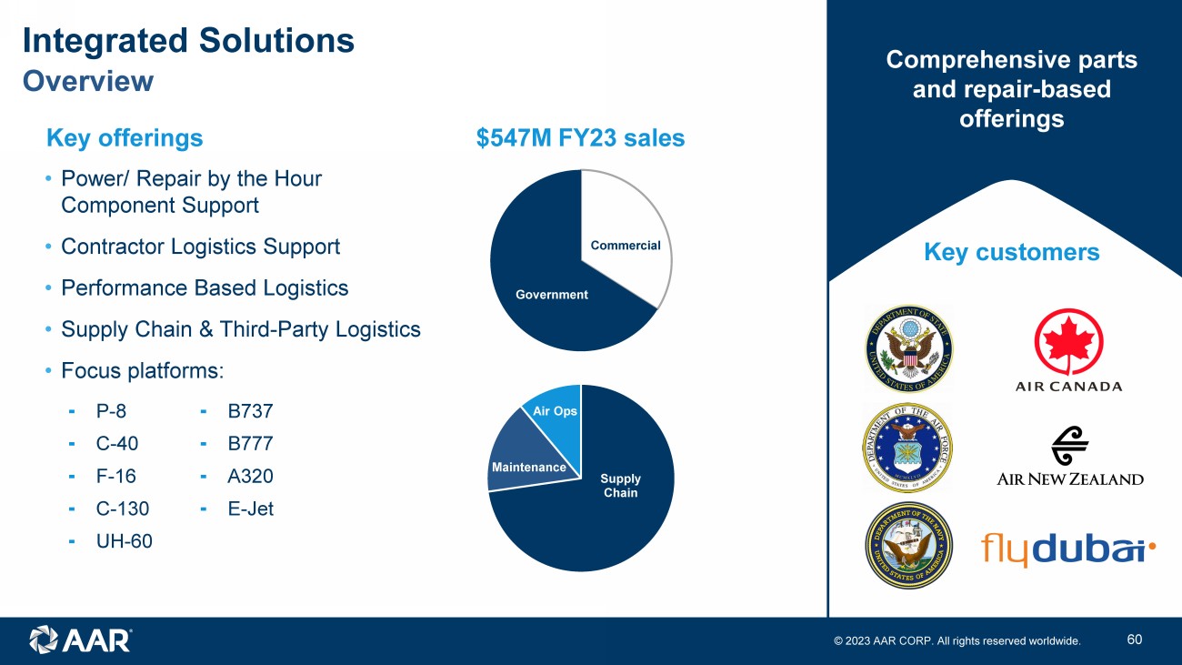 © 2023 AAR CORP. All rights reserved worldwide. 15 Overview Integrated Solutions Key offerings • Power/ Repair by the Hour Component Support • Contractor Logistics Support • Performance Based Logistics • Supply Chain & Third - Party Logistics • Focus platforms: Comprehensive parts and repair - based offerings Key customers Commercial Government Supply Chain Maintenance Air Ops $547M FY23 sales ⁃ P - 8 ⁃ B737 ⁃ C - 40 ⁃ B777 ⁃ F - 16 ⁃ A320 ⁃ C - 130 ⁃ E - Jet ⁃ UH - 60