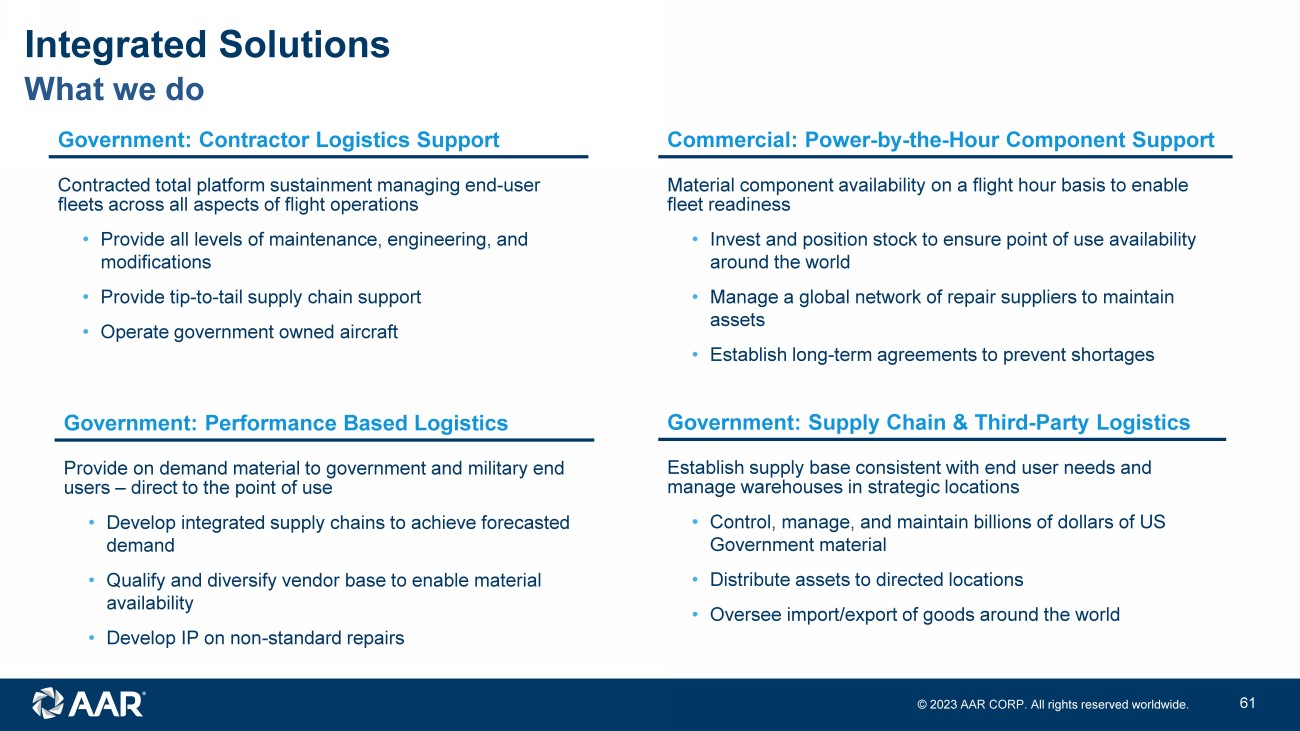 © 2023 AAR CORP. All rights reserved worldwide. 16 What we do Integrated Solutions Government: Contractor Logistics Support Contracted total platform sustainment managing e nd - user fleets across all aspects of flight operations • Provide all levels of maintenance, engineering, and modifications • Provide tip - to - tail supply chain support • Operate government owned aircraft Government: Supply Chain & Third - Party Logistics Establish supply base consistent with end user needs and manage warehouses in strategic locations • Control, manage, and maintain billions of dollars of US Government material • Distribute assets to directed locations • Oversee import/export of goods around the world Government: Performance Based Logistics Provide on demand material to government and military end users – direct to the point of use • Develop integrated supply chains to achieve forecasted demand • Qualify and diversify vendor base to enable material availability • Develop IP on non - standard repairs Commercial: Power - by - the - Hour Component Support Material component availability on a flight hour basis to enable fleet readiness • Invest and position stock to ensure point of use availability around the world • Manage a global network of repair suppliers to maintain assets • Establish long - term agreements to prevent shortages