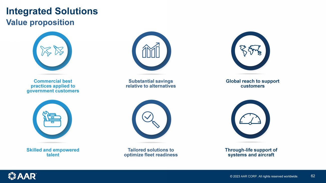 © 2023 AAR CORP. All rights reserved worldwide. 17 Value proposition Integrated Solutions Commercial best practices applied to government customers Substantial savings relative to alternatives Global reach to support customers Skilled and empowered talent Tailored solutions to optimize fleet readiness Through - life support of systems and aircraft