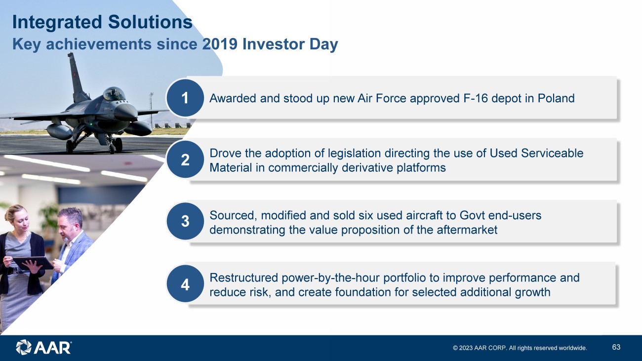© 2023 AAR CORP. All rights reserved worldwide. 18 Key achievements since 2019 Investor Day Integrated Solutions 1 2 3 4 Restructured power - by - the - hour portfolio to improve performance and reduce risk, and create foundation for selected additional growth Awarded and stood up new Air Force approved F - 16 depot in Poland Sourced, modified and sold six used aircraft to Govt end - users demonstrating the value proposition of the aftermarket Drove the adoption of legislation directing the use of Used Serviceable Material in commercially derivative platforms