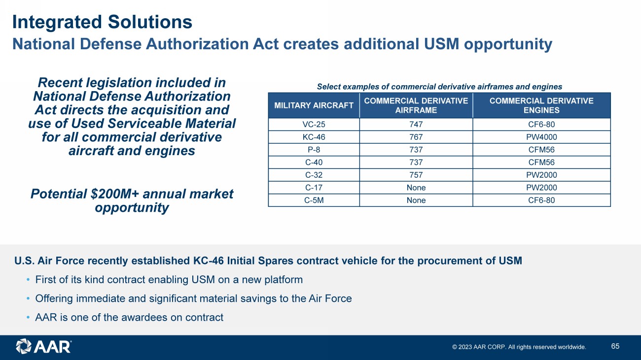 © 2023 AAR CORP. All rights reserved worldwide. 20 National Defense Authorization Act creates additional USM opportunity U.S. Air Force recently established KC - 46 Initial Spares contract vehicle for the procurement of USM • First of its kind contract enabling USM on a new platform • Offering immediate and significant material savings to the Air Force • AAR is one of the awardees on contract MILITARY AIRCRAFT COMMERCIAL DERIVATIVE AIRFRAME COMMERCIAL DERIVATIVE ENGINES VC - 25 747 CF6 - 80 KC - 46 767 PW4000 P - 8 737 CFM56 C - 40 737 CFM56 C - 32 757 PW2000 C - 17 None PW2000 C - 5M None CF6 - 80 Integrated Solutions Recent legislation included in National Defense Authorization Act directs the acquisition and use of Used Serviceable Material for all commercial derivative aircraft and engines Potential $200M+ annual market opportunity Select examples of commercial derivative airframes and engines