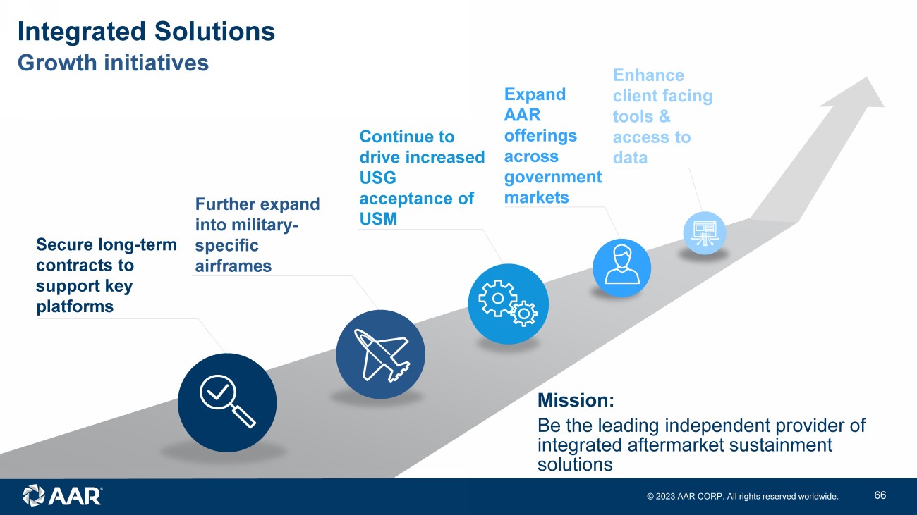 © 2023 AAR CORP. All rights reserved worldwide. 21 Growth initiatives Integrated Solutions Secure long - term contracts to support key platforms Further expand into military - specific airframes Continue to drive increased USG acceptance of USM Expand AAR offerings across government markets Enhance client facing tools & access to data Mission: Be the leading independent provider of integrated aftermarket sustainment solutions