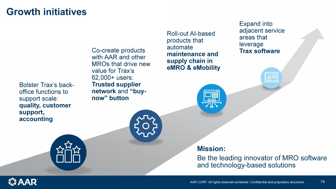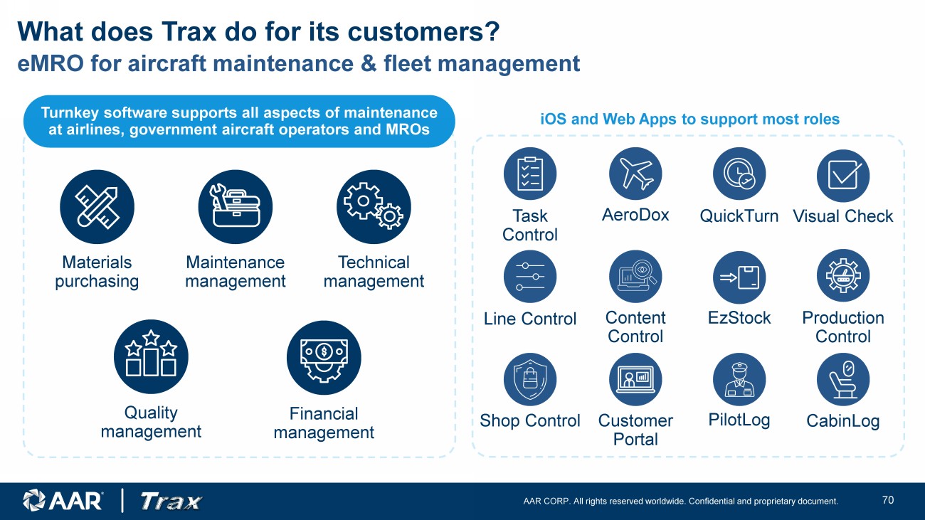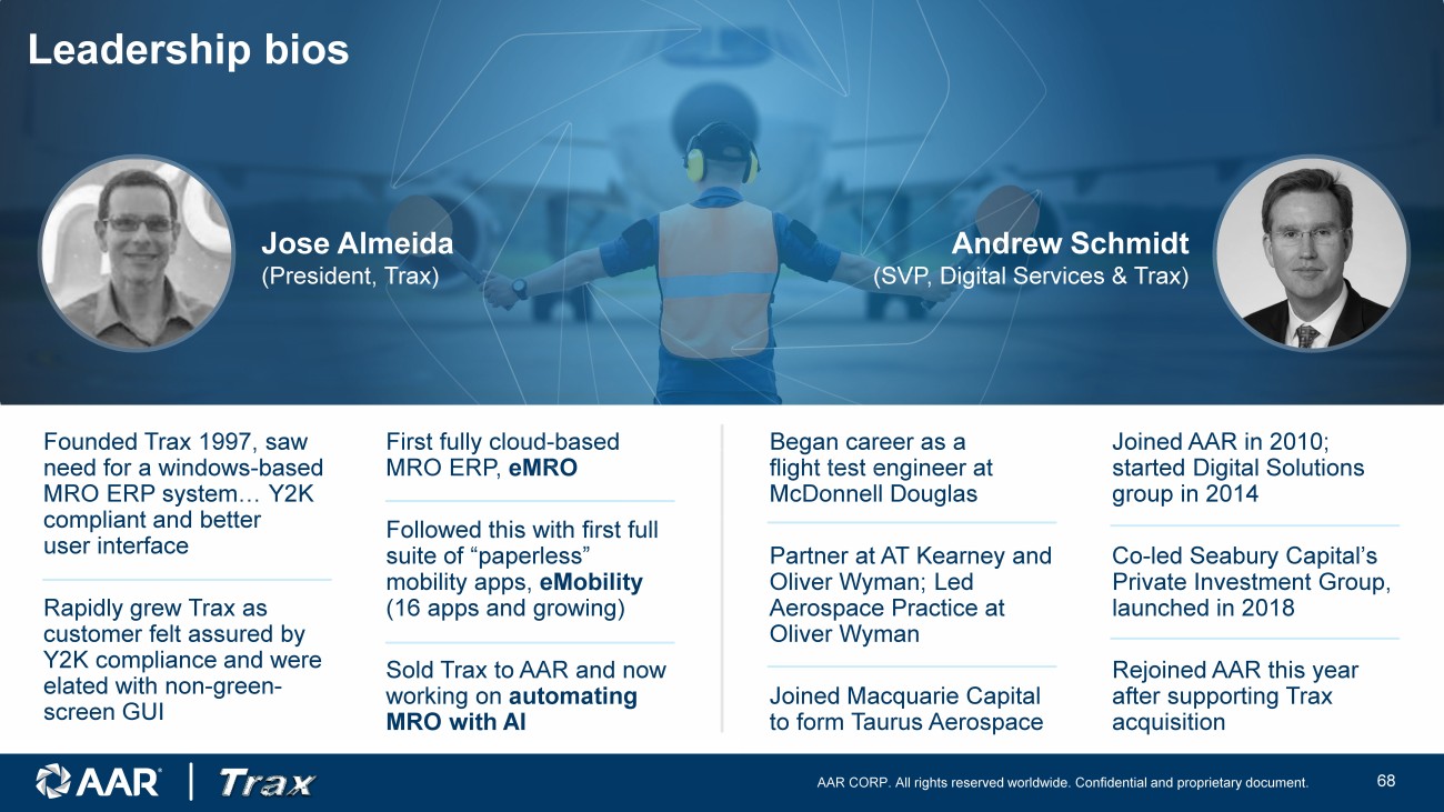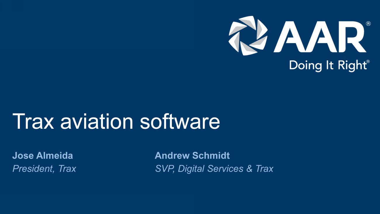 AAR CORP. All rights reserved worldwide. Confidential and proprietary document. 23 Founded Trax 1997, saw need for a windows - based MRO ERP system… Y2K compliant and better user interface Rapidly grew Trax as customer felt assured by Y2K compliance and were elated with non - green - screen GUI First fully cloud - based MRO ERP, eMRO Followed this with first full suite of “paperless” mobility apps, eMobility (16 apps and growing) Sold Trax to AAR and now working on automating MRO with AI Began career as a flight test engineer at McDonnell Douglas Partner at AT Kearney and Oliver Wyman; Led Aerospace Practice at Oliver Wyman Joined Macquarie Capital to form Taurus Aerospace Joined AAR in 2010; started Digital Solutions group in 2014 Co - led Seabury Capital’s Private Investment Group, launched in 2018 Rejoined AAR this year after supporting Trax acquisition Jose Almeida (President, Trax) Andrew Schmidt (SVP, Digital Services & Trax) Leadership bios