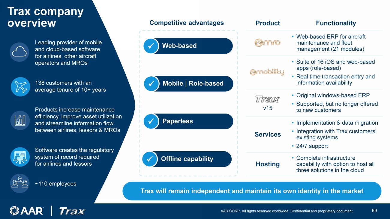 AAR CORP. All rights reserved worldwide. Confidential and proprietary document. 24 Leading provider of mobile and cloud - based software for airlines, other aircraft operators and MROs 138 customers with an average tenure of 10+ years Products increase maintenance efficiency, improve asset utilization and streamline information flow between airlines, lessors & MROs Software creates the regulatory system of record required for airlines and lessors ~110 employees Competitive advantages Offline capability x Paperless x Web - based x Mobile | Role - based x Product Functionality • Web - based ERP for aircraft maintenance and fleet management (21 modules) • Suite of 16 iOS and web - based apps (role - based) • Real time transaction entry and information availability v15 • Original windows - based ERP • Supported, but no longer offered to new customers Services • Implementation & data migration • Integration with Trax customers’ existing systems • 24/7 support Hosting • Complete infrastructure capability with option to host all three solutions in the cloud Trax will remain independent and maintain its own identity in the market Trax company overview
