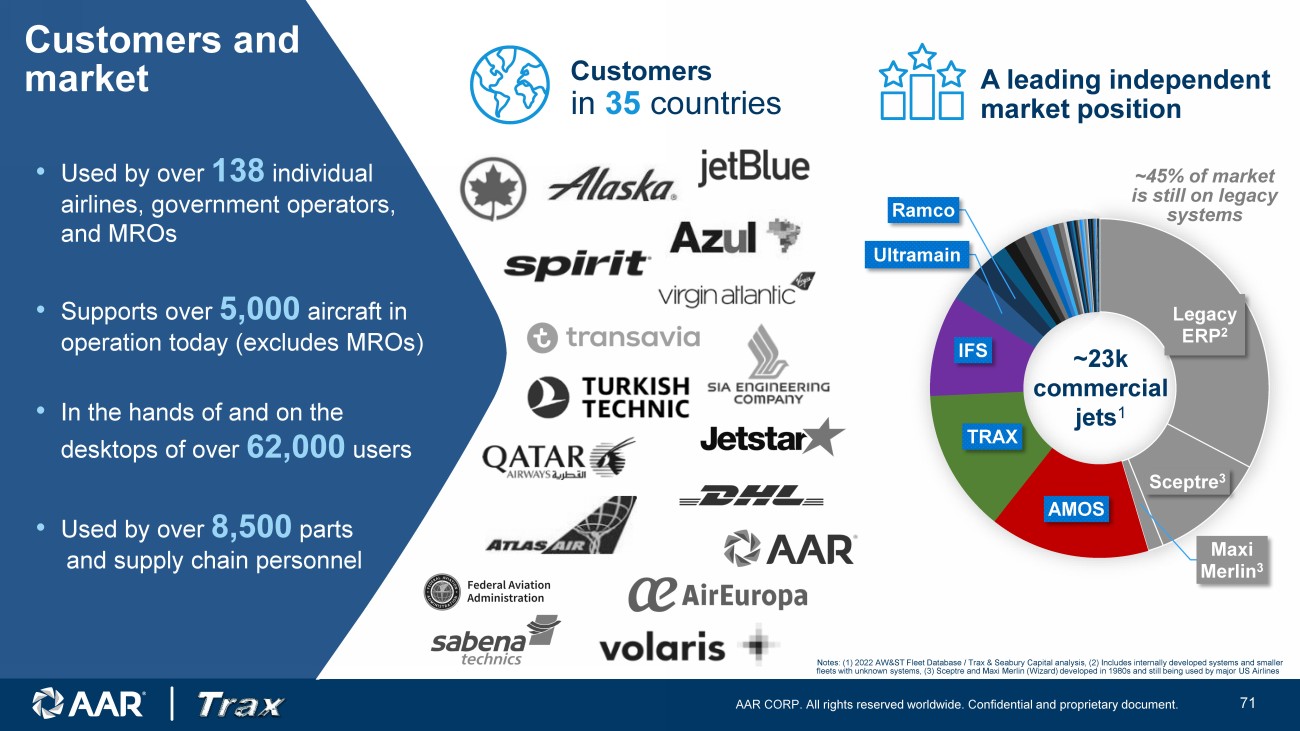 AAR CORP. All rights reserved worldwide. Confidential and proprietary document. 26 z • Used by over 138 individual airlines, government operators, and MROs • Supports over 5,000 aircraft in operation today (excludes MROs) • In the hands of and on the desktops of over 62,000 users • Used by over 8,500 parts and supply chain personnel Customers in 35 countries Customers and market Legacy ERP 2 Sceptre 3 Maxi Merlin 3 AMOS TRAX IFS Ultramain Ramco ~23k commercial jets 1 A l eading independent market position ~45% of market is still on legacy systems Notes: (1) 2022 AW&ST Fleet Database / Trax & Seabury Capital analysis, (2) Includes internally developed systems and smaller fleets with unknown systems, (3) Sceptre and Maxi Merlin (Wizard) developed in 1980s and still being used by major US Airlines