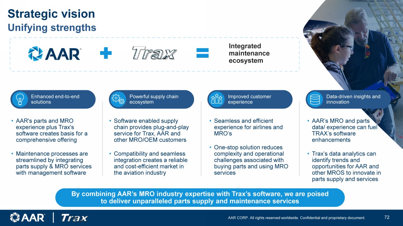 AAR CORP. All rights reserved worldwide. Confidential and proprietary document. 27 • AAR's parts and MRO experience plus Trax's software creates basis for a comprehensive offering • Maintenance processes are streamlined by integrating parts supply & MRO services with management software • Software enabled supply chain provides plug - and - play service for Trax, AAR and other MRO/OEM customers • Compatibility and seamless integration creates a reliable and cost - efficient market in the aviation industry • Seamless and efficient experience for airlines and MRO’s • One - stop solution reduces complexity and operational challenges associated with buying parts and using MRO services Integrated maintenance ecosystem Enhanced end - to - end solutions Powerful supply chain ecosystem Improved customer experience • AAR’s MRO and parts data/ experience can fuel TRAX’s software enhancements • Trax’s data analytics can identify trends and opportunities for AAR and other MROS to innovate in parts supply and services Data - driven insights and innovation By combining AAR’s MRO industry expertise with Trax’s software, we are poised to deliver unparalleled parts supply and maintenance services Strategic vision Unifying strengths