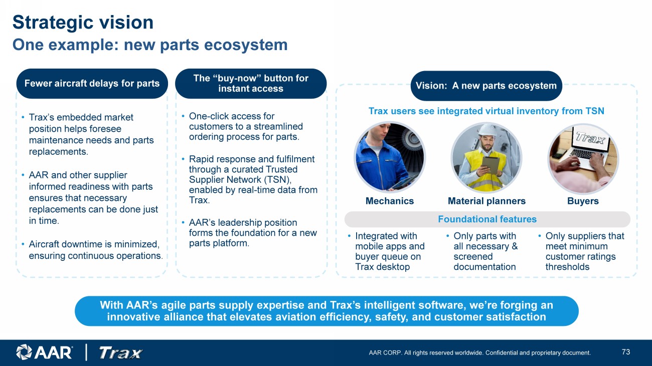 AAR CORP. All rights reserved worldwide. Confidential and proprietary document. 28 • Trax’s embedded market position helps foresee maintenance needs and parts replacements. • AAR and other supplier informed readiness with parts ensures that necessary replacements can be done just in time. • Aircraft downtime is minimized, ensuring continuous operations . • One - click access for customers to a streamlined ordering process for parts. • Rapid response and fulfilment through a curated Trusted Supplier Network (TSN), enabled by real - time data from Trax. • AAR’s leadership position forms the foundation for a new parts platform. With AAR’s agile parts supply expertise and Trax’s intelligent software, we’re forging an innovative alliance that elevates aviation efficiency, safety, and customer satisfaction Fewer aircraft delays for parts The “buy - now” button for instant access Vision: A new parts ecosystem Foundational features • Integrated with mobile apps and buyer queue on Trax desktop Trax users see integrated virtual inventory from TSN • Only parts with all necessary & screened documentation • Only suppliers that meet minimum customer ratings thresholds Mechanics Material planners Buyers Strategic vision One example: new parts ecosystem