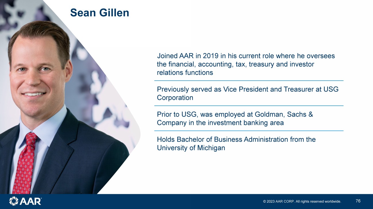 © 2023 AAR CORP. All rights reserved worldwide. 31 Sean Gillen Joined AAR in 2019 in his current role where he oversees the financial, accounting, tax, treasury and investor relations functions Previously served as Vice President and Treasurer at USG Corporation Prior to USG, was employed at Goldman, Sachs & Company in the investment banking area Holds Bachelor of Business Administration from the University of Michigan