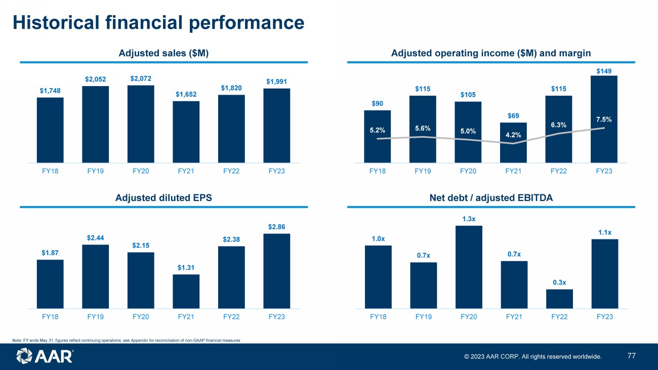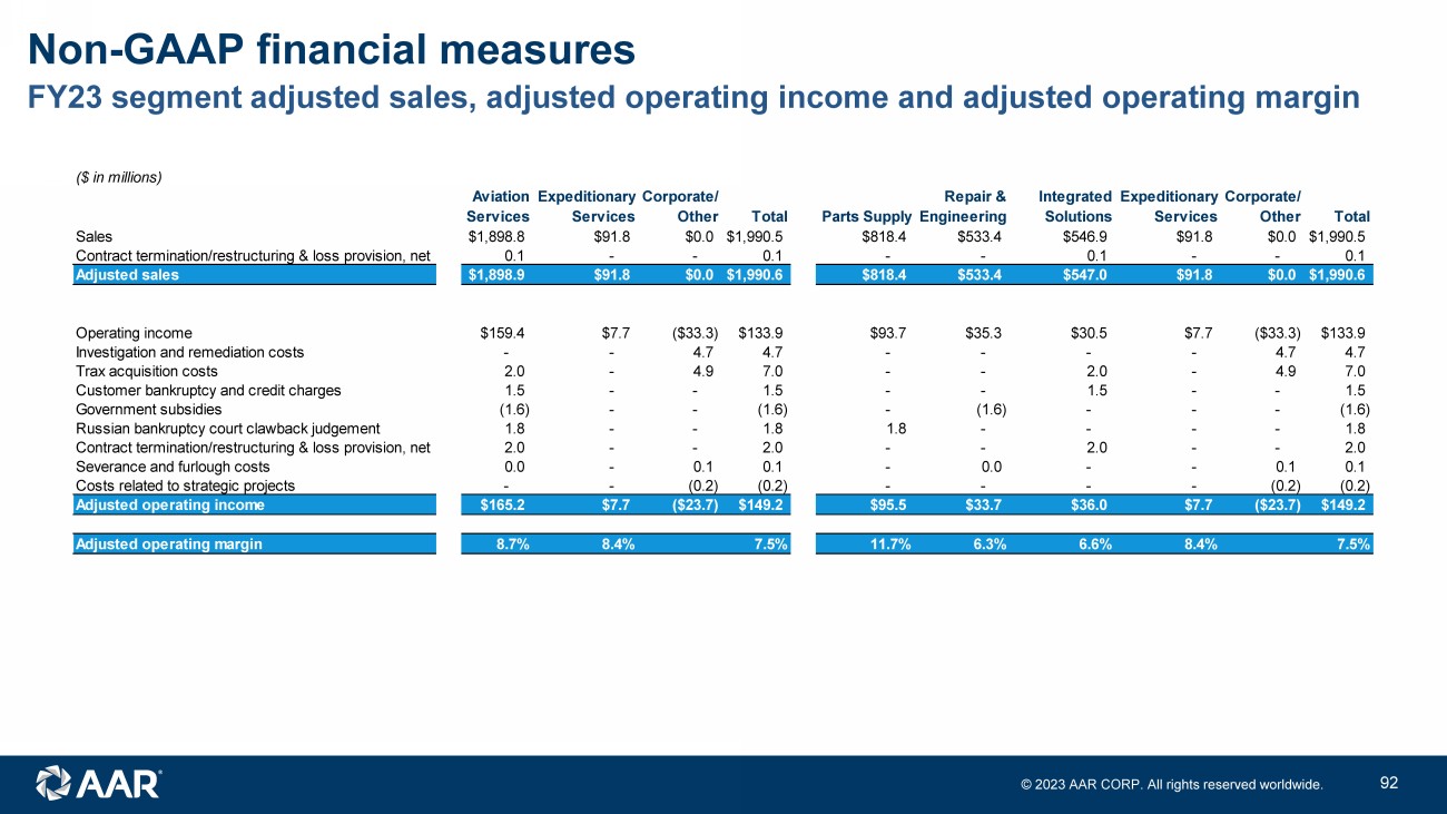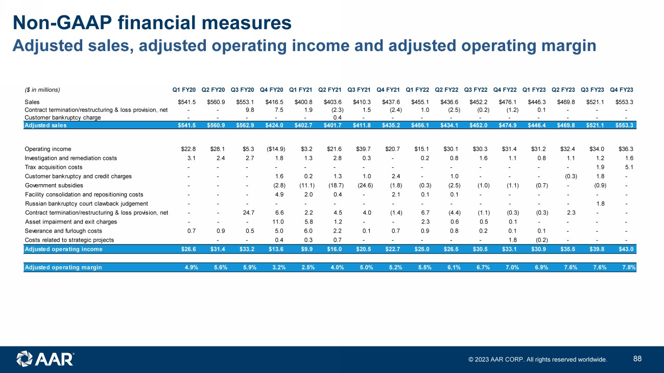 © 2023 AAR CORP. All rights reserved worldwide. 43 Adjusted sales, adjusted operating income and adjusted operating margin Non - GAAP financial measures ($ in millions) Q1 FY20 Q2 FY20 Q3 FY20 Q4 FY20 Q1 FY21 Q2 FY21 Q3 FY21 Q4 FY21 Q1 FY22 Q2 FY22 Q3 FY22 Q4 FY22 Q1 FY23 Q2 FY23 Q3 FY23 Q4 FY23 Sales $541.5 $560.9 $553.1 $416.5 $400.8 $403.6 $410.3 $437.6 $455.1 $436.6 $452.2 $476.1 $446.3 $469.8 $521.1 $553.3 Contract termination/restructuring & loss provision, net - - 9.8 7.5 1.9 (2.3) 1.5 (2.4) 1.0 (2.5) (0.2) (1.2) 0.1 - - - Customer bankruptcy charge - - - - - 0.4 - - - - - - - - - - Adjusted sales $541.5 $560.9 $562.9 $424.0 $402.7 $401.7 $411.8 $435.2 $456.1 $434.1 $452.0 $474.9 $446.4 $469.8 $521.1 $553.3 Operating income $22.8 $28.1 $5.3 ($14.9) $3.2 $21.6 $39.7 $20.7 $15.1 $30.1 $30.3 $31.4 $31.2 $32.4 $34.0 $36.3 Investigation and remediation costs 3.1 2.4 2.7 1.8 1.3 2.8 0.3 - 0.2 0.8 1.6 1.1 0.8 1.1 1.2 1.6 Trax acquisition costs - - - - - - - - - - - - - - 1.9 5.1 Customer bankruptcy and credit charges - - - 1.6 0.2 1.3 1.0 2.4 - 1.0 - - - (0.3) 1.8 - Government subsidies - - - (2.8) (11.1) (18.7) (24.6) (1.8) (0.3) (2.5) (1.0) (1.1) (0.7) - (0.9) - Facility consolidation and repositioning costs - - - 4.9 2.0 0.4 - 2.1 0.1 0.1 - - - - - - Russian bankruptcy court clawback judgement - - - - - - - - - - - - - - 1.8 - Contract termination/restructuring & loss provision, net - - 24.7 6.6 2.2 4.5 4.0 (1.4) 6.7 (4.4) (1.1) (0.3) (0.3) 2.3 - - Asset impairment and exit charges - - - 11.0 5.8 1.2 - - 2.3 0.6 0.5 0.1 - - - - Severance and furlough costs 0.7 0.9 0.5 5.0 6.0 2.2 0.1 0.7 0.9 0.8 0.2 0.1 0.1 - - - Costs related to strategic projects - - 0.4 0.3 0.7 - - - - - 1.8 (0.2) - - - Adjusted operating income $26.6 $31.4 $33.2 $13.6 $9.9 $16.0 $20.5 $22.7 $25.0 $26.5 $30.5 $33.1 $30.9 $35.5 $39.8 $43.0 Adjusted operating margin 4.9% 5.6% 5.9% 3.2% 2.5% 4.0% 5.0% 5.2% 5.5% 6.1% 6.7% 7.0% 6.9% 7.6% 7.6% 7.8%